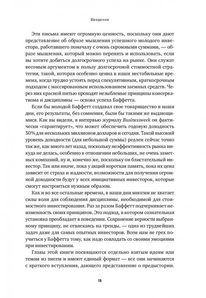 Инвестиционного гуру Уоррена Баффетта многие называют «провидцем». Сам Баффетт говорит, что предсказывать поведение рынка бессмысленно и только терпение, бережливость и верность принципам помогут достичь долговременного успеха. Такого прагматичного подхода он придерживается с момента организации своего первого товарищества Buffett Partnership Limited (BPL) в 1956 г. Именно тогда молодой Баффетт начал раз в полугодие рассылать партнерам письма, в которых рассказывал о результатах работы и подробно объяснял свои методы инвестирования. Баффетт не пишет книг, но его письма партнерам, собранные в этом издании, дают возможность понять образ мыслей и философию инвестирования великого предпринимателя. Автор — составитель книги инвестиционный аналитик Джереми Миллер, объединив письма по темам, анализирует историю успеха компании BPL с 1956 по 1970 г. — периода, по признанию самого Баффетта, с самой высокой доходностью, которую он когда-либо получал. Изложенные здесь подходы, несмотря на эволюцию в методах инвестирования, не теряют актуальности и по сей день.