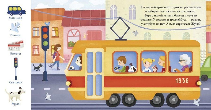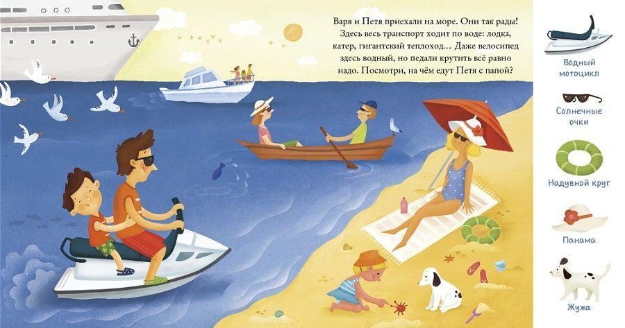 Петя и Варя приехали на море! Они так рады! Здесь весь транспорт ходит по воде: лодка, катер, гигантский теплоход. Даже велосипед здесь водный, но педали крутить все равно надо. В этой замечательной книжке красочные иллюстрации с крупными элементами, коротким и доступным текстом — все для того, чтобы кроха с удовольствием учился. Рассматривайте вместе картинки, ищите предметы, вынесенные на край страницы, а шустрая собачка Жужа не даст заскучать, она будет сопровождать вас на протяжении всего путешествия. Книжку приятно брать в руки: странички плотные, а иллюстрации красочные и яркие. Пока ребенок рассматривает картинки и ищет предметы, он будет знакомиться с окружающим миром и узнает много интересного о машинах, лодках, пароходах, трамваях и поездах. Вы и сами будете с удовольствием рассматривать книгу. Ведь самое важное — ваши совместные занятия с малышом.