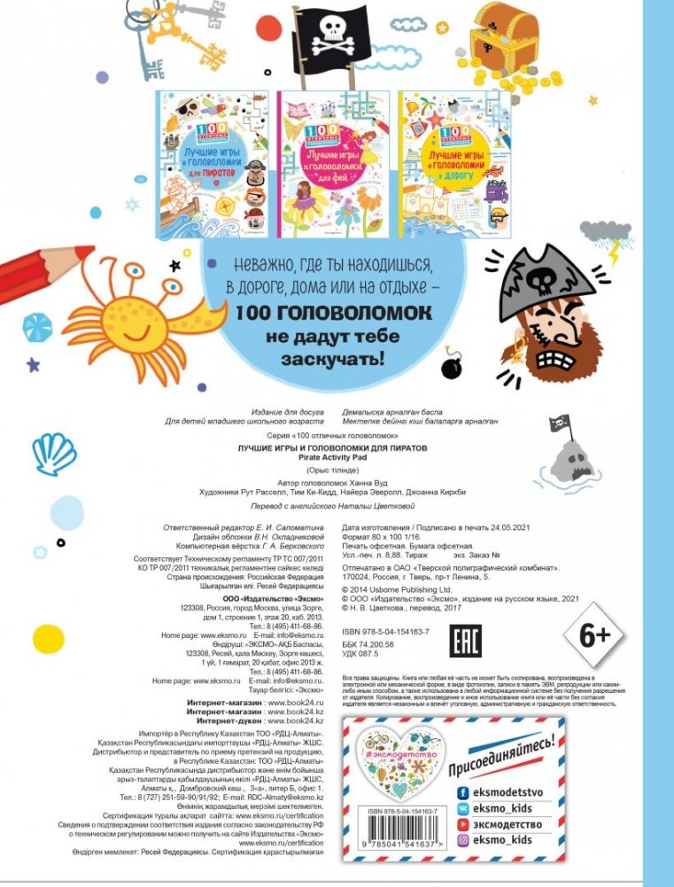 С этой книгой не заскучаешь ни на отдыхе, ни в дороге, ни дома в дождливый день! Юным пиратам придется поломать голову, чтобы решить все 100 головоломок, причем все эти задачки и игры совсем разные: здесь и лабиринты, и поиски отличий, и мини-судоку, и логические задачки, и игры со словами! А еще можно научиться рисовать Веселого Роджера, пиратов и пиратский корабль!
