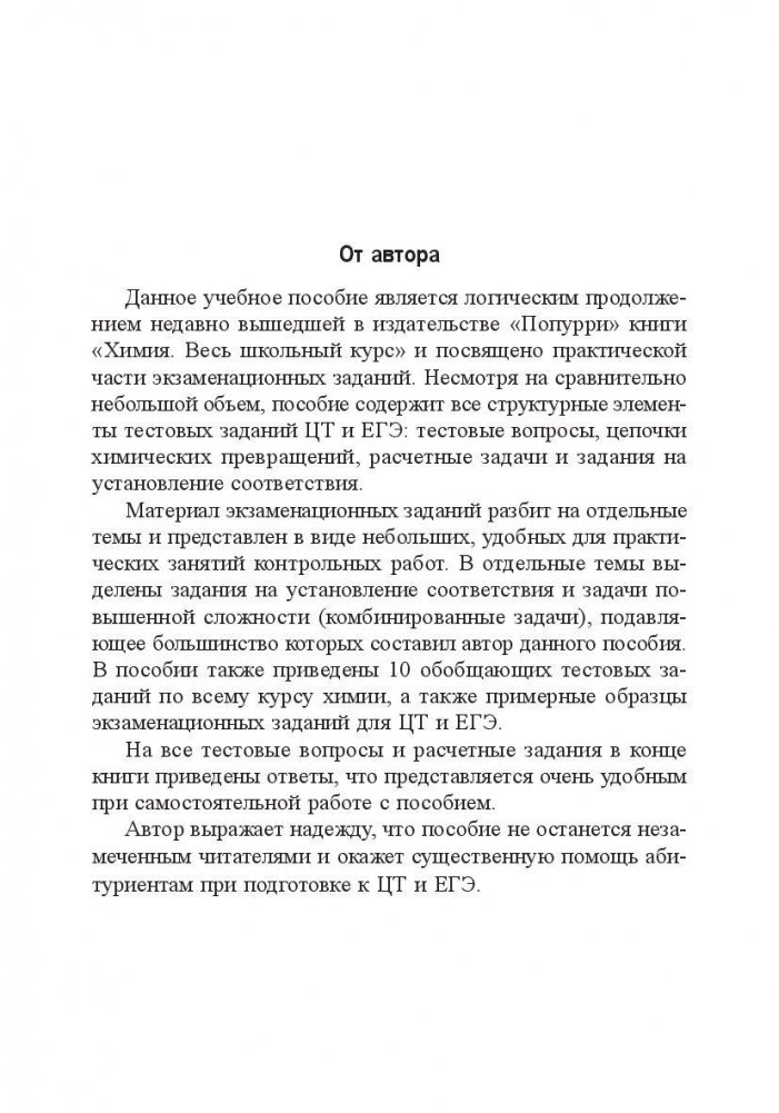 Пособие содержит весь необходимый материал, который формирует тестовое задание для ЦТ и ЕГЭ по химии: тестовые вопросы, расчетные задачи, цепочки химических превращений, задания на установление соответствия. Приведены обобщающие тесты по всему школьному курсу химии, образцы тестовых заданий для ЦТ и ЕГЭ, комбинированные задачи повышенной сложности. Адресуется школьникам старших классов, абитуриентам, педагогам общеобразовательных школ, лицеев и гимназий, а также репетиторам по химии.