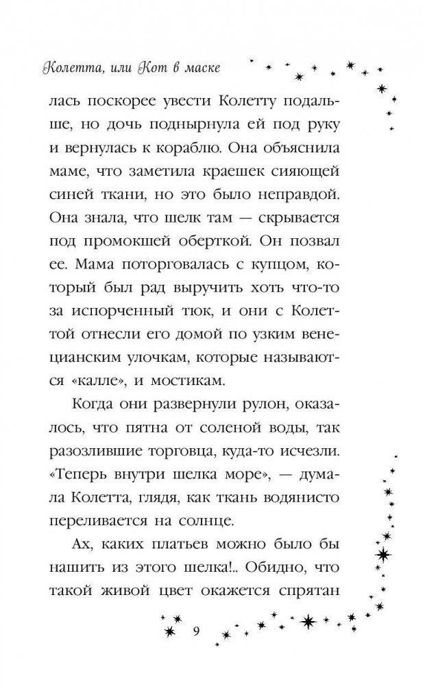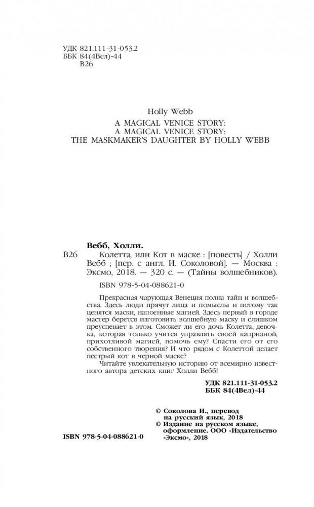 Прекрасная чарующая Венеция полна тайн и волшебства. Здесь люди прячут лица и помыслы и потому так ценятся маски, напоенные магией. Здесь первый в городе мастер берется изготовить волшебную маску и слишком преуспевает в этом. Сможет ли его дочь Колетта, девочка, которая только учится управлять своей капризной, прихотливой магией, помочь ему? Спасти его от его собственного творения? И что рядом с Колеттой делает пестрый кот в черной маске? Читайте увлекательную историю от всемирно известного автора детских книг Холли Вебб!
