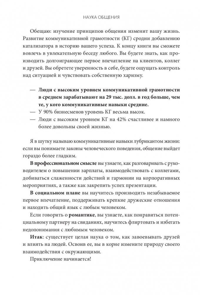 Яркая и практичная книга о ключевых принципах человеческого общения, которая поможет вам чувствовать себя уверенно в любой ситуации. Как начать разговор и обратить на себя внимание? Как поближе узнать собеседника? Как влиять на коллег и друзей? Ванесса ван Эдвардс приводит в книге важнейшие принципы человеческого общения, которые помогут вам качественно изменить свою жизнь. Этим принципам не учат в школах и университетах, но именно они определяют, преуспеем ли мы на работе или в личных отношениях, или нет. Когда вы изучите законы человеческого поведения и взаимодействия, сможете производить прекрасное первое впечатление и быстро налаживать контакт в любой ситуации — от переговоров и собеседований до вечеринок. Выгода не заставит себя ждать.