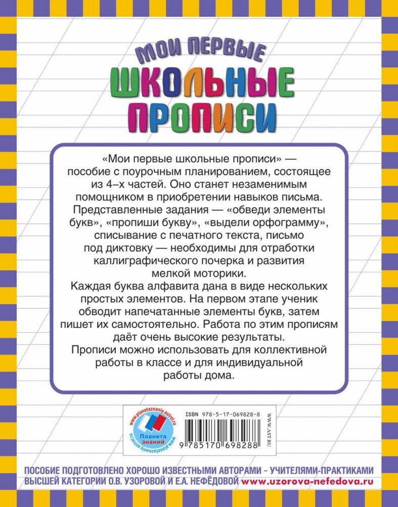 "Мои первые школьные прописи" - пособие с поурочным планированием, состоящее из 4-х частей. Оно станет незаменимым помощником в приобретении навыков письма. Представленные задания - "обведи элементы букв", "пропиши букву", "выдели орфограмму", списывание с печатного текста, письмо под диктовку - необходимы для отработки каллиграфического почерка и развития мелкой моторики. Каждая буква алфавита дана в виде нескольких простых элементов. На первом этапе ученик обводит напечатанные элементы букв, затем пишет их самостоятельно. Работа по этим прописям дает очень высокие результаты. Прописи можно использовать для коллективной работы в классе и для индивидуальной работы дома.
