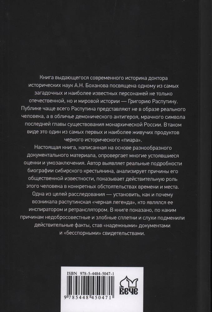 Книга выдающегося современного историка доктора исторических наук А. Н. Боханова посвящена одному из самых загадочных и наиболее известных персонажей не только отечественной, но и мировой истории — Григорию Распутину. Публике чаще всего Распутина представляют не в образе реального человека, а в обличье демонического антигероя, мрачного символа последней главы существования монархической России. В таком виде это один из самых первых и наиболее живучих продуктов черного исторического «пиара».