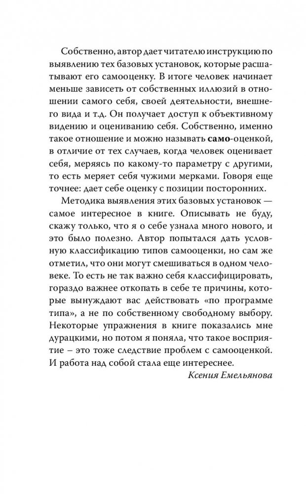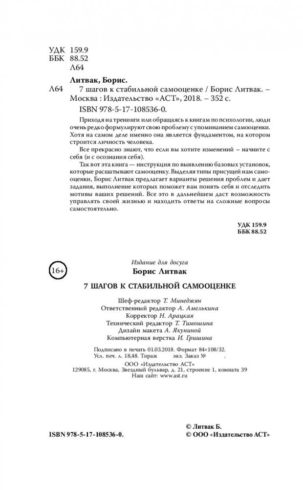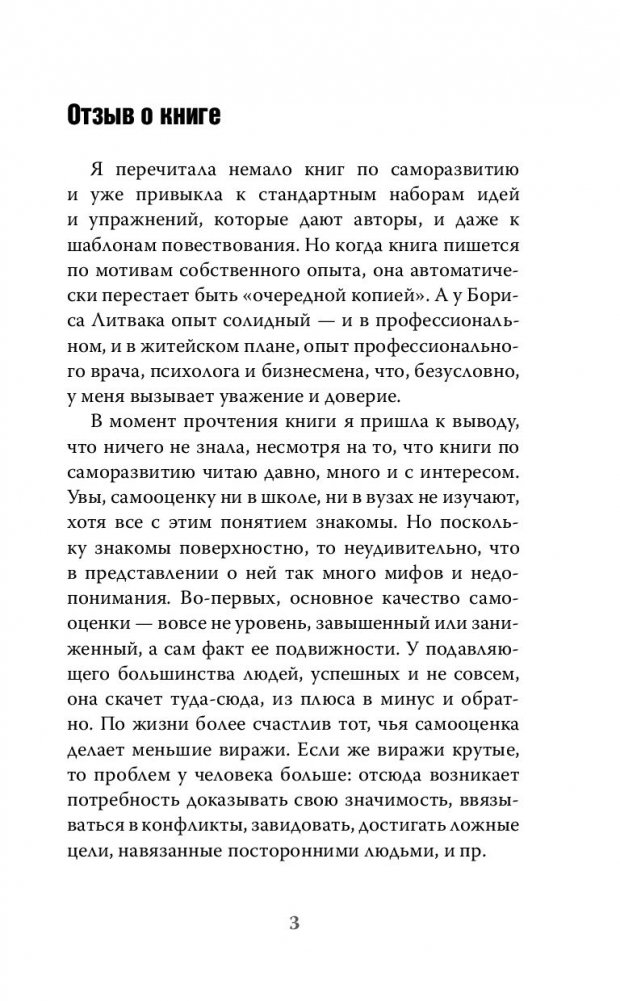 Борис Литвак – бизнесмен и бизнес-тренер, директор клуба КРОСС, создатель авторских программ «Новый уровень мышления», «Фундамент Цели», «Роли в группе», «Сценарное перепрограммирование», программ по саморазвитию и самооценке. Приходя на тренинги или обращаясь к книгам по психологии, люди очень редко формулируют свою проблему с упоминанием самооценки. Хотя на самом деле именно она является фундаментом, на котором строится личность человека. Все прекрасно знают, что если вы хотите изменений – начните с себя (и с осознания себя). Но как это сделать и понять, на что именно нужно обратить внимание, распознать свой тип взаимоотношений с миром? Это хороший вопрос, на который Борис Литвак дает свой ответ. – Как устроена психика человека? – Как мы принимаем решения и выбираем свой путь развития? – Почему достигаем или не достигаем успеха? – Как выбираем партнеров и строим с ними отношения? Выделяя типы присущей нам самооценки, Борис Литвак предлагает варианты решения проблем и дает задания, выполнение которых поможет вам понять себя и отследить мотивы ваших решений. Все это в дальнейшем даст возможность управлять своей жизнью и находить ответы на сложные вопросы самостоятельно.