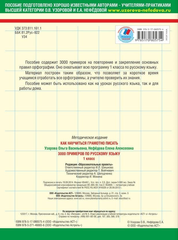 Пособие содержит 3000 новых примеров на повторение и закрепление основных правил орфографии и пунктуации. Оно охватывает всю программу 1 класса по русскому языку. Особенностью этого издания является крупный шрифт. Материал построен таким образом, что позволяет за короткое время учащимся отработать все орфограммы и пунктограммы, а учителю проверить их знания. Пособие может быть использовано как на уроках русского языка, так и для работы дома.