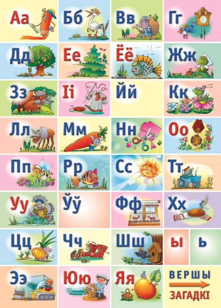 З аднаго боку гэтага настольнага дапаможніка размешчаны літары і каляровыя ілюстрацыі, а з адваротнага боку — вершы і загадкі. Ліст можна разрэзаць на асобныя карткі і правесці гульнёвыя (індывідуальныя ці групавыя) заняткі з дзецьмі.