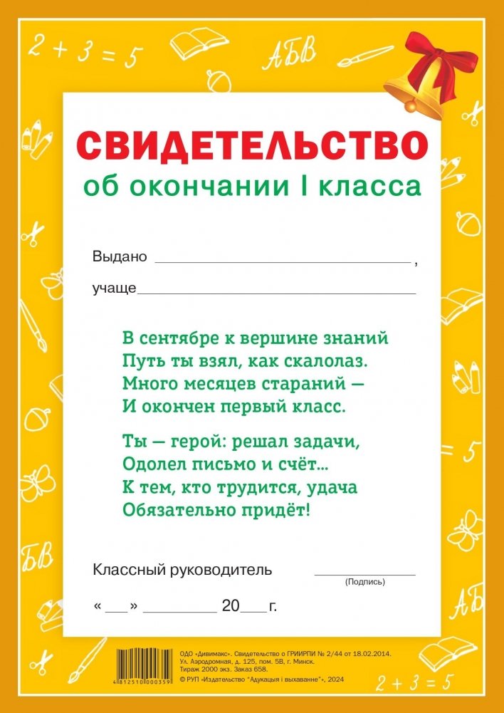 Свидетельство об окончании 1 класса с подписью классного руководителя и прекрасными стихами в адрес будущего второклассника станут прекрасным напоминанием о первом - самом волнительном и интересном - годе, проведенном в стенах школы. Выполненное из плотного картона, оно надолго сохранится в семейном архиве.
