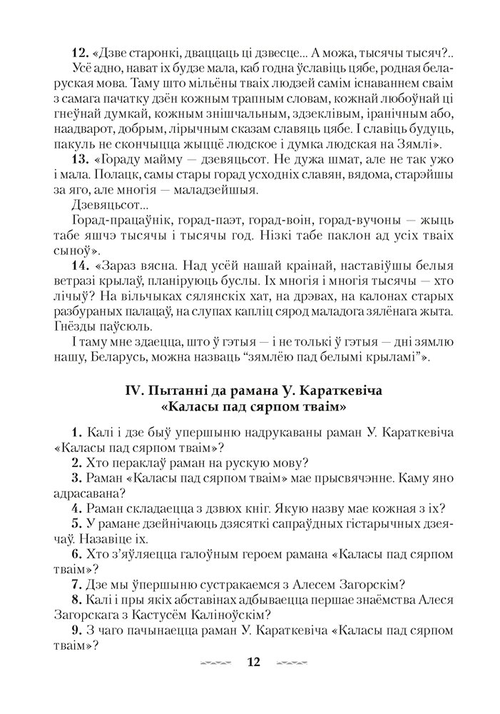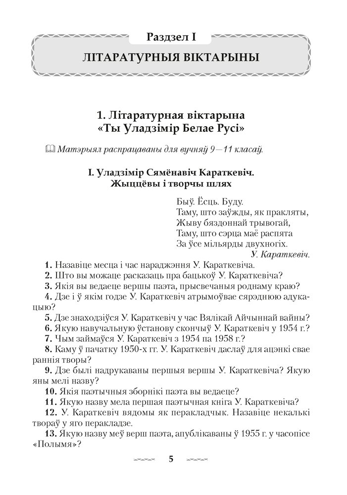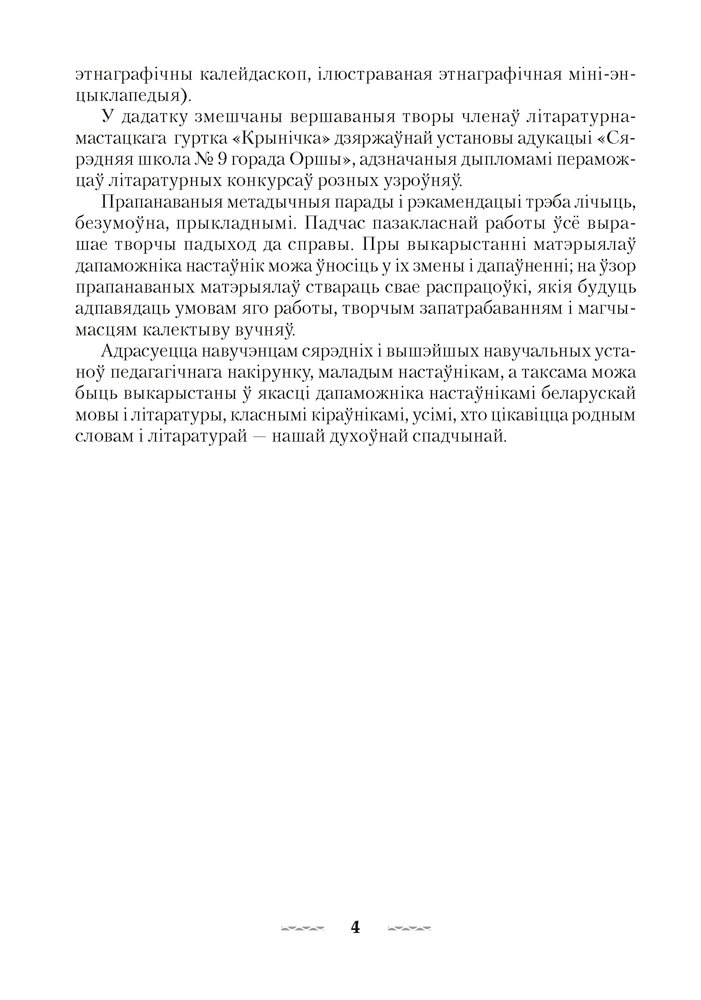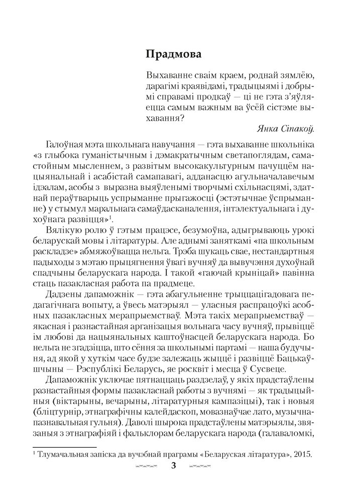 Дапаможнік змяшчае распрацоўкі пазакласных мерапрыемстваў па беларускай мове і літаратуры, накіраваных на якасную і разнастайную арганізацыю вольнага часу вучняў, прывіццё ім любові да нацыянальных каштоўнасцей. У пятнаццаці раздзелах кнігі прадстаўлены як традыцыйныя, так і новыя формы пазакласнай работы.