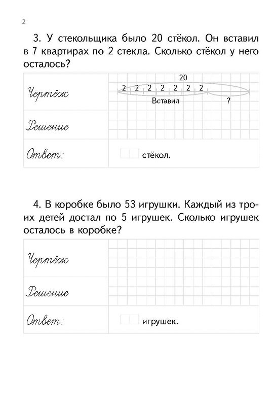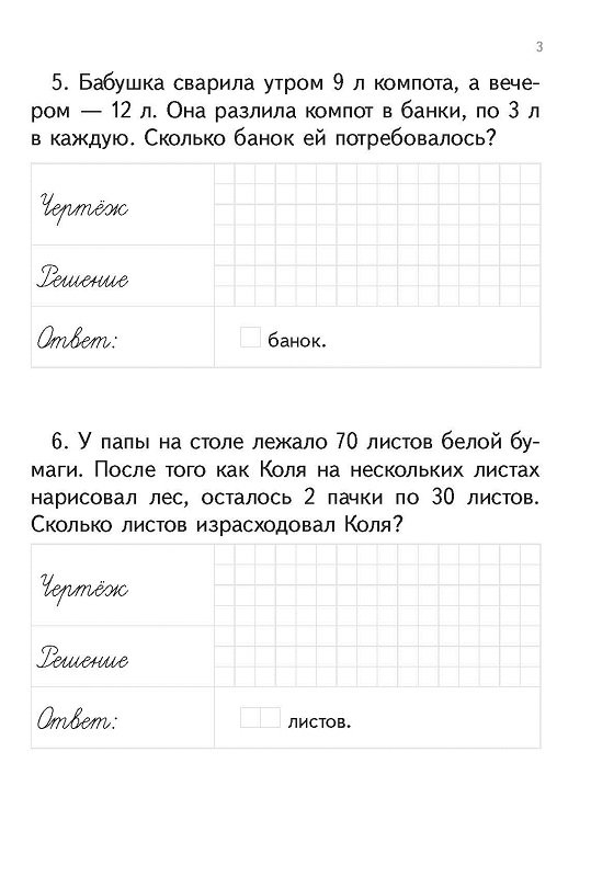 Задания сгруппированы по принципу от простого к сложному, что позволяет не только закрепить навыки, полученные на уроках математики, но и развить их. Первую задачу каждого вида сопровождает чертеж, помогающий понять принцип, лежащий в основе решения. Для последующих задач ребенок должен составить чертеж самостоятельно. Материалы пособия полностью соответствуют учебной программе для III класса.