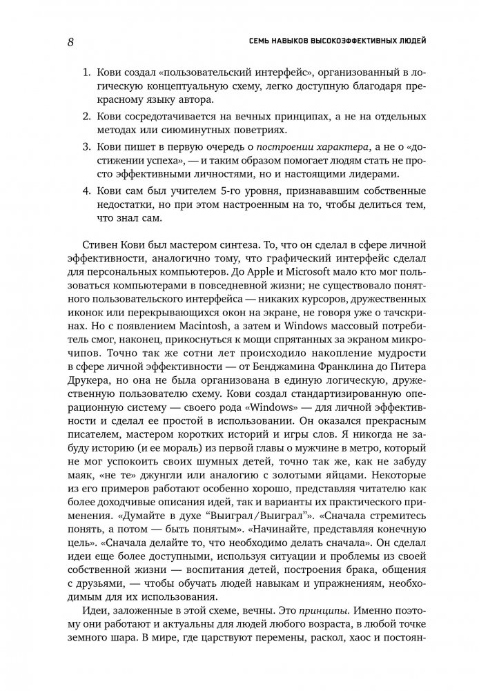 Эта книга — мировой супербестселлер, работа № 1 по теме личностного роста. Она оказала большое влияние на жизни миллионов людей во всем мире, включая Билла Клинтона, Ларри Кинга и Стивена Форбса. Половина крупнейших мировых корпораций, входящих в рейтинг Fortune 500, посчитали своим долгом ознакомить своих сотрудников с философией эффективности, изложенной в «Семи навыках».