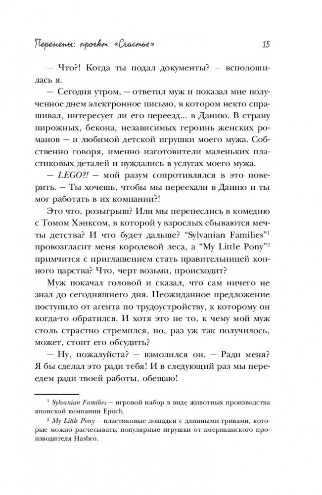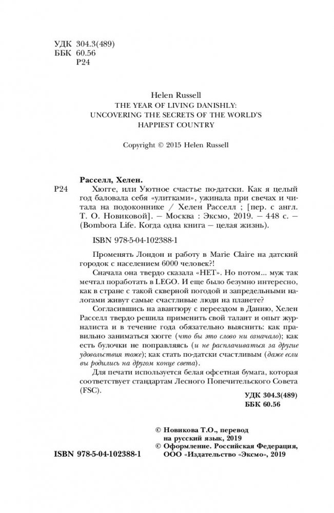 Променять Лондон и работу в Marie Claire на датский городок с населением 6000 человек?! Сначала она твердо сказала "НЕТ". Но потом… муж так мечтал поработать в LEGO. И еще было безумно интересно, как в стране с такой скверной погодой и запредельными налогами живут самые счастливые люди на планете? Согласившись на авантюру с переездом в Данию, Хелен Расселл твердо решила применить свой талант и опыт журналиста и в течение года обязательно выяснить: как правильно заниматься хюгге (что бы это слово ни означало); как есть булочки не поправляясь (и не расплачиваться за другие удовольствия тоже); как стать по-датски счастливым (даже если вы родились на другом конце света). Для печати используется белая офсетная бумага, которая соответствует стандартам Лесного Попечительского Совета (FSC).