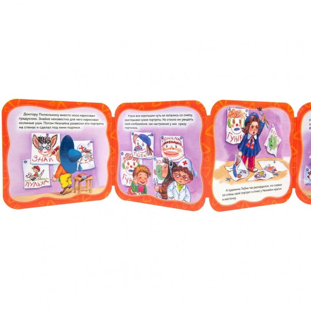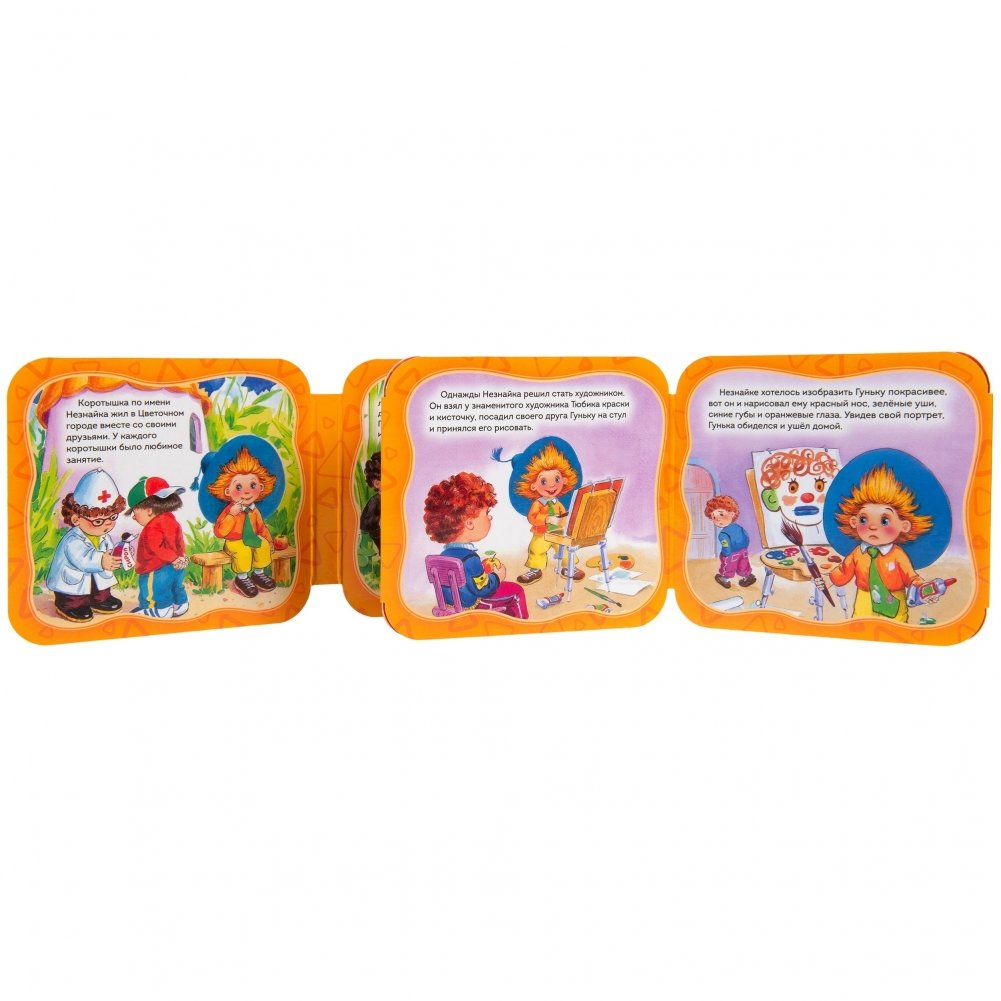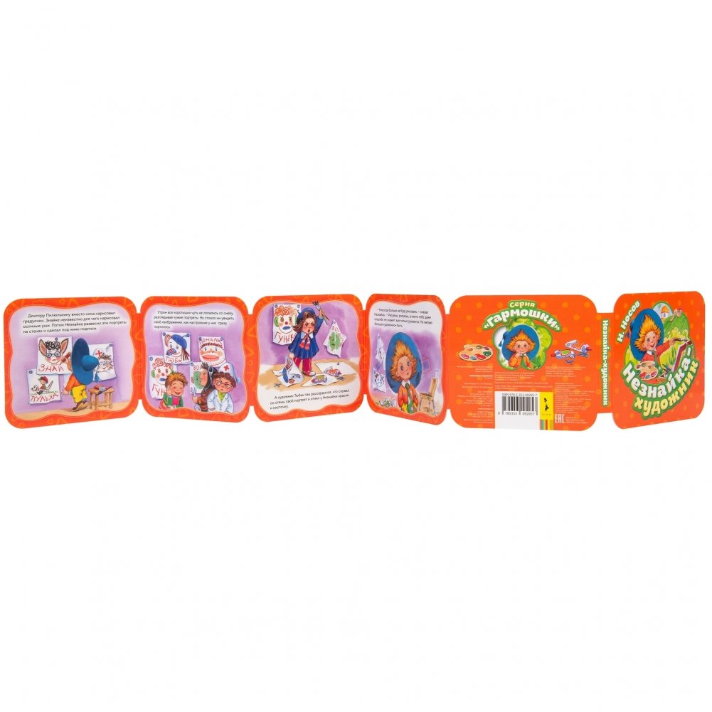 Незнайка решил стать художником, вот только портреты коротышек у него получились злые и обидные. Смешная и поучительная история о приключениях одного из самых любимых детских героев. Книжка-гармошка с яркими, веселыми иллюстрациями прекрасно подойдет для совместного чтения и игры с ребенком.