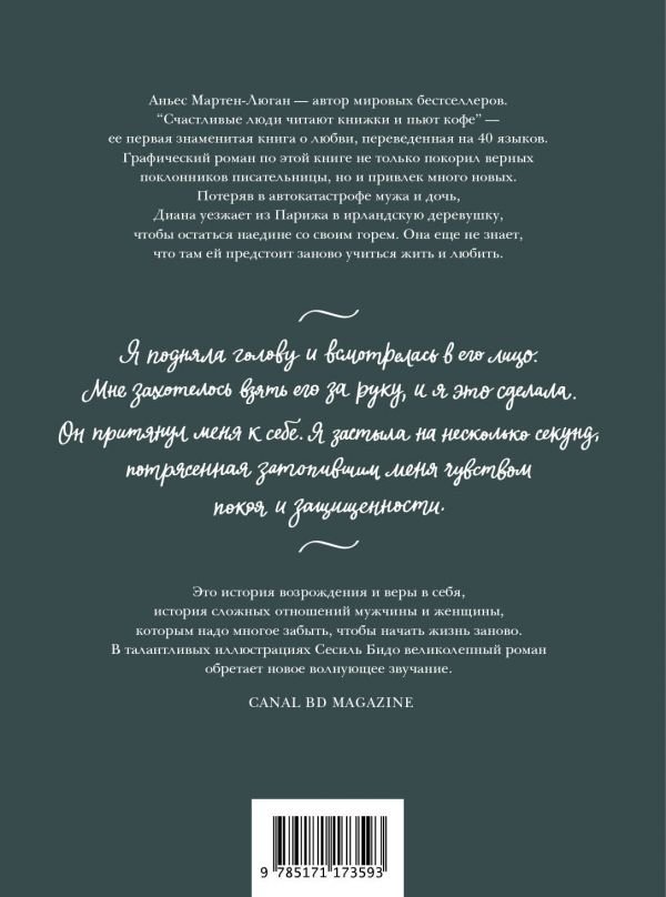 Вот уже год Диана ежедневно совершает один и тот же ритуал: спит всю ночь в обнимку с Клариным плюшевым мишкой, а проснувшись, надевает рубашку Колена, брызгается его духами и проклинает себя за то, что не села тогда в машину вместе с ними. Машина столкнулась с грузовиком. Ее муж и дочь погибли. А жизнь потеряла смыл. Теперь, кроме ежедневного ритуала, ее существование включает в себя сигареты, алкоголь, пустой холодильник и постоянные воспоминания, которые приносят только боль. Когда отчаяние достигает предела, она решает уехать из Парижа. Куда угодно. Например, в Ирландию. Да, почему бы не туда. Колен всегда хотел увидеть эту страну. Так Диана оказывается в Малларанни. Здесь она сталкивается с хмурым и неразговорчивым соседом Эдвардом и обретает призрачный шанс начать свою жизнь заново. Но призраки прошлого не готовы отпустить ее так просто. Став графическим романом, бестселлер Аньес Мартен-Люган сохранил и напряженность сюжета, и чарующую атмосферу – благодаря безупречному сценарию Вероники Гриссо и яркой рисовке художницы Сесиль Бидо.