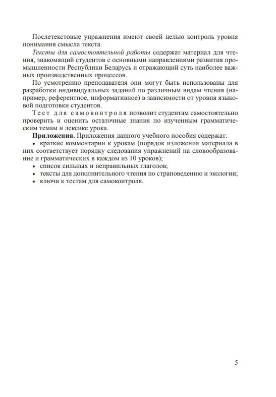 Содержит тексты и упражнения, направленные на формирование навыков чтения и перевода научно-технической литературы поиска и извлечения информации, обработки и оформления ее в письменной и устной речи, умений вести беседу по прочитанному, а также тесты к каждому уроку. Приложения включают комментарии к урокам, список основных форм сильных и неправильных глаголов, тексты для дополнительного чтения, а также ключи к тестам.