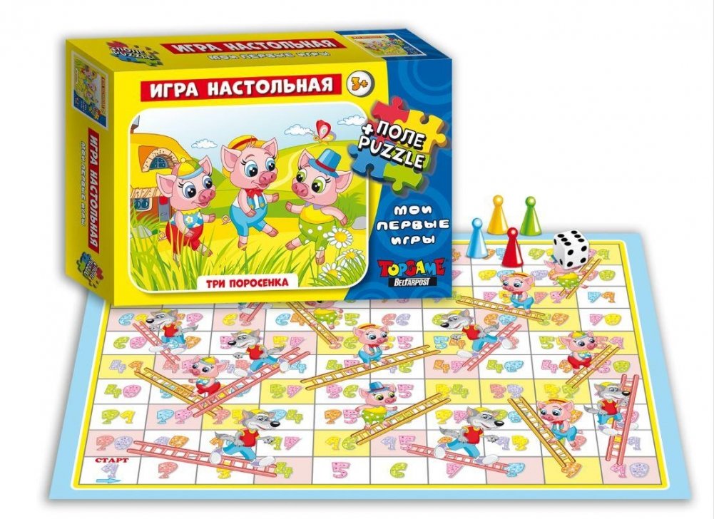 В состав игры входит: двухстороннее игровое поле - пазл из 12 элементов, 4 фишки, игральный кубик 1 шт.