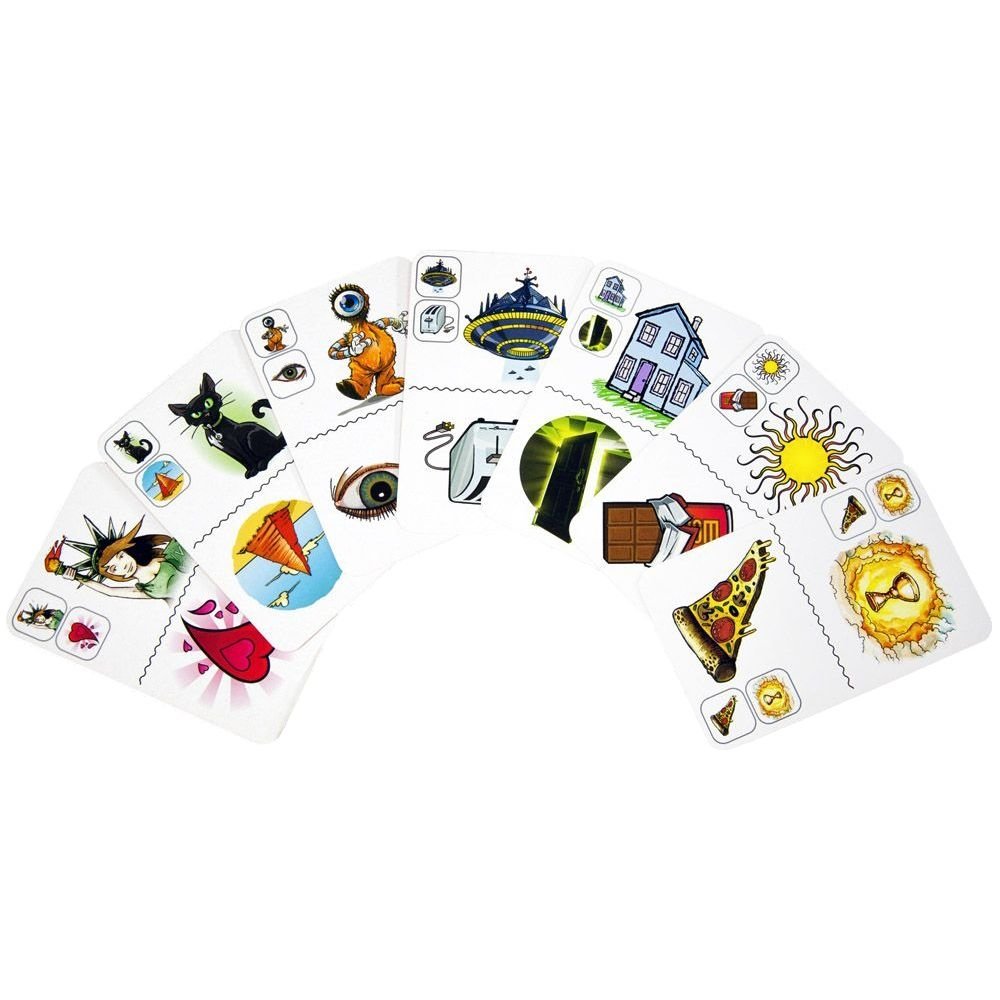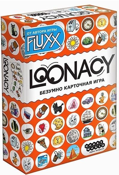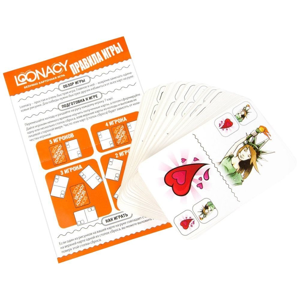 Loonacy (Лунаси) – очень забавная и веселая игра, в которой победит тот, что проворнее и внимательнее. Суть игры заключается в том, чтобы быстрее всех остальных избавится от карт в руке. Сделать это можно только одним способом: сбросить. На каждой карте есть по две картинки, и если одна из них совпадает с картинкой на карте в вашей руке, вы можете сбросить карту. После этого уже картинки только что сброшенной карты являются ориентиром для игроков. Нет никаких ходов, кто быстрее тот и молодец. Единственное правило – сбрасывать по одной карте за раз. Но никто не мешает сбросить хоть всю руку по одной карте, если вы смогли собрать карты с подходящими картинками. Но не обольщайтесь. Другие игроки могут делать то же самое. А если двое участников сбрасывают карту одновременно, засчитывается та, которая первая коснулась стопки сброса. А значит необходимо учиться метать картон быстро и метко.