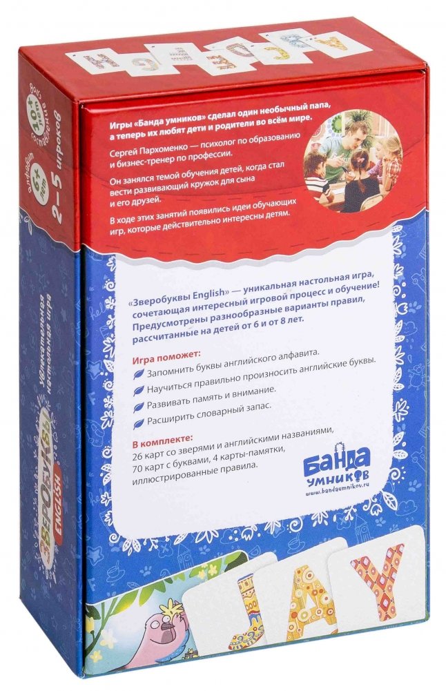 Методика проста и хорошо знакома всем по русским «Зверобуквам» — собирая названия зверей из букв на столе, игроки запоминают визуальные образы букв, а заодно учат их названия. Так что для того, чтобы начинать играть, не нужно знать английский.