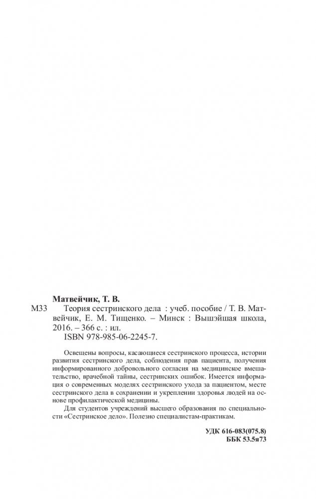 Освещены вопросы, касающиеся сестринского процесса, истории развития сестринского дела, соблюдения прав пациента, получения информированного добровольного согласия на медицинское вмешательство, врачебной тайны, сестринских ошибок. Имеется информация о современных моделях сестринского ухода за пациентом, месте сестринского дела в сохранении и укреплении здоровья людей на основе профилактической медицины.