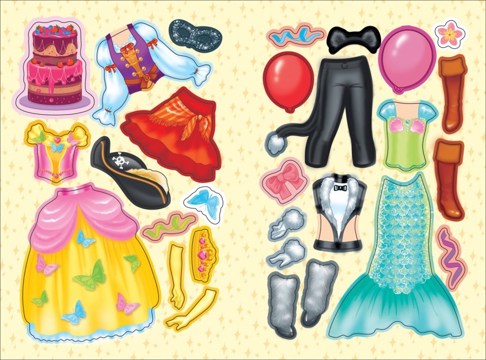 Самая увлекательная игра для маленьких модниц! Открывай яркую панорамную картинку, выбирай для веселых подружек одежду и аксессуары, приклеивай их на фигурки - и вот твои куколки-красавицы уже готовы к праздничному карнавалу! Наряды можно составлять в разных сочетаниях и переделывать по-новому - ведь многоразовые наклейки можно переклеивать сколько угодно раз!