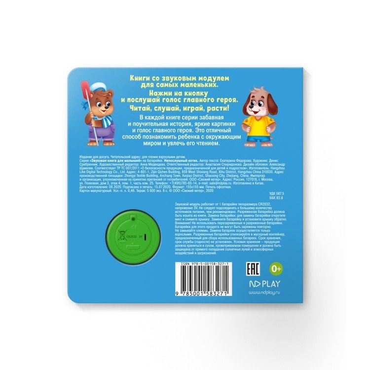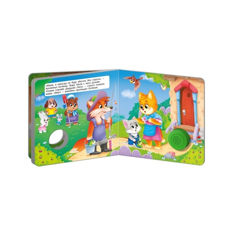 Книги со звуковым модулем для самых маленьких. Нажми на кнопку и послушай голос главного героя. Читай, слушай, играй, расти! В каждой книге серии забавная и поучительная история, яркие картинки и голос главного героя. Это отличный способ познакомить ребенка с окружающим миром и увлечь его чтением. Малыш будет с удовольствием рассматривать яркие страницы и читать историю главных героев книги. Книжка сделана из плотного картона с глянцевой ламинацией, поэтому родители могут не опасаться, что ребёнок порвёт странички. Благодаря компактному формату (15,5х15,5 см) её удобно брать с собой в дорогу. Книжка укомплектована батарейками. Одна кнопка - один звук.