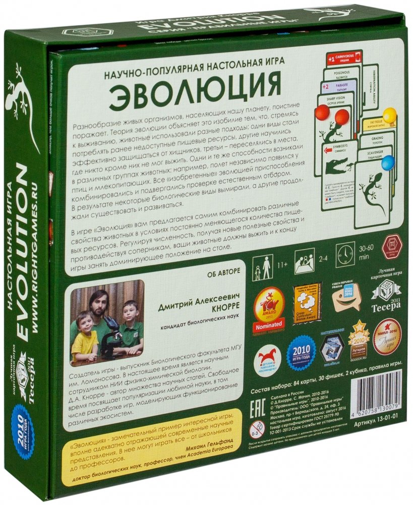 В игре "Эволюция" игрокам предлагается самим комбинировать различные свойства животных и развивать собственную популяцию в условиях постоянно меняющегося количества ресурсов - еды. Регулируя численность животных, получая новые, полезные свойства и противодействуя соперникам, популяция игрока должна выжить и к концу игры занять доминирующее положение в экосистеме.