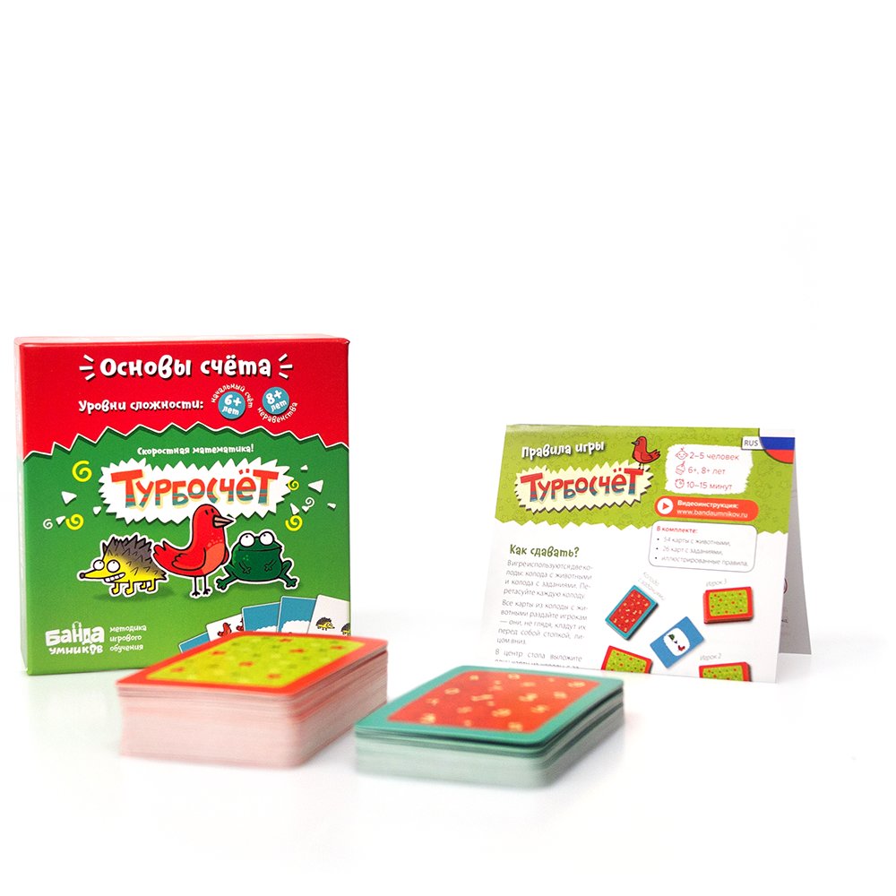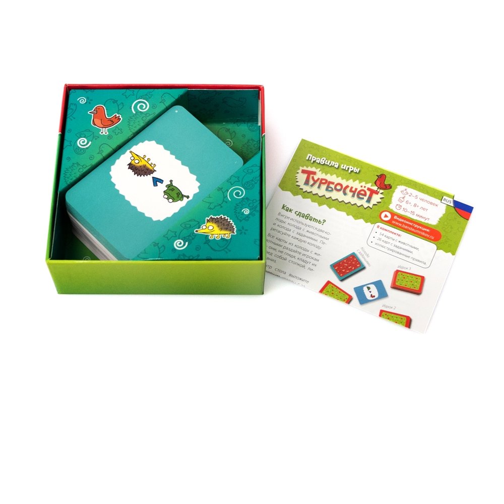 Игровая механика очень проста, поэтому даже дошкольники могут легко играть в "Турбосчёт" без участия взрослых. Из колоды в центр стола выкладывается карточка с условием, игроки по очереди открывают карты со случайным количеством животных одного из видов: когда условие выполняется - нужно первым накрыть ладонью карту с условием! Такие простые правила в сочетании с высокой эффективностью и захватывающим игровым процессом делают эту обучающую игру почти незаменимой для дошкольников и младших школьников.