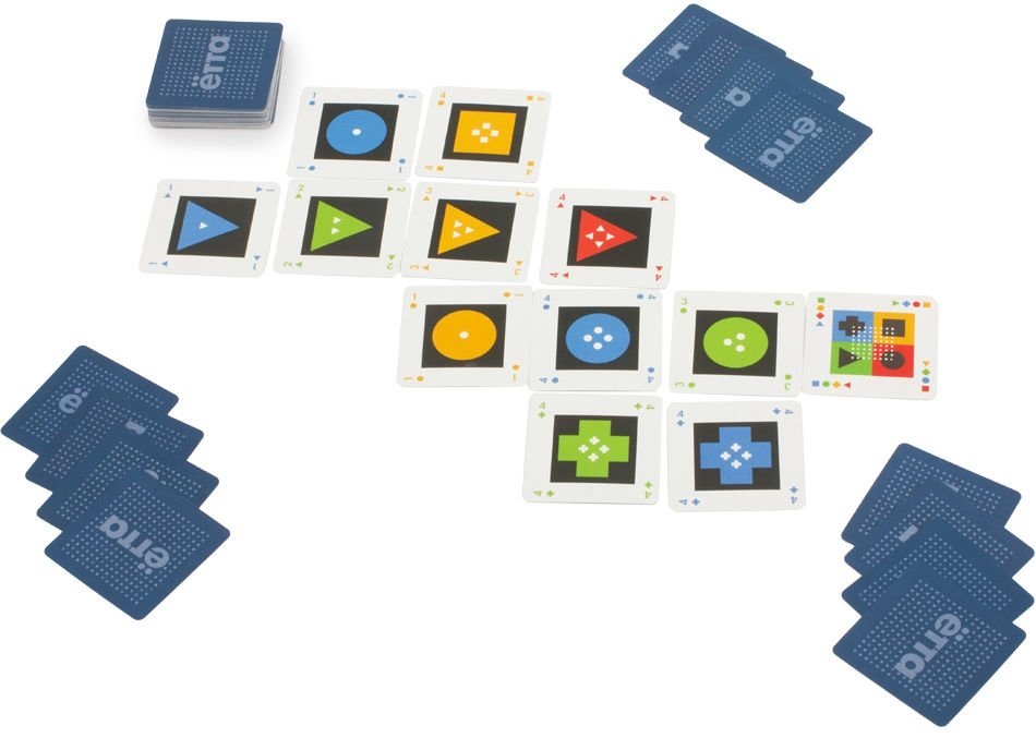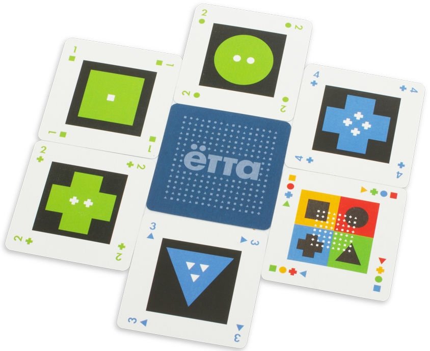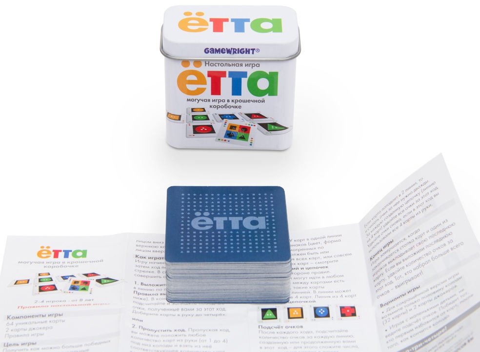 Ётта – могучая игра в крошечной коробочке! Это простая логическая игра для всех: правила её предельно понятны, а процесс очень увлекателен. Игра содержит 64 карты, у каждой из которых есть по 3 признака: цвет, форма и число внутри. Игрокам раздаётся по 4 карты, одна карта кладется в центр стола. Далее игроки по очереди могут выложить 1, 2, 3 или 4 карты, чтобы получилась Линия, а лучше Цепочка. Игрокам нужно держать в голове одновременно три признака карт, а также видеть всю картину в целом, чтобы не пропустить место для своей карты.