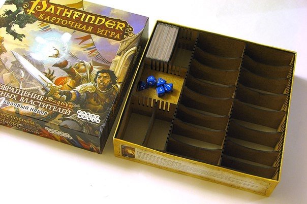 Органайзер умещается внутри русской коробки карточной игры Pathfinder. Крышка коробки закрывается.