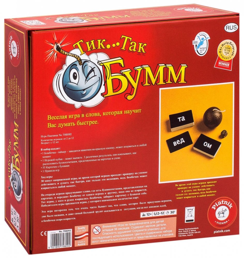 Настольная игра «Тик Так Бумм» - увлекательная игра для компании. По правилам, игроку необходимо быстро придумать слово, содержащее определенный набор букв. Во время игры через всех игроков переходит "бомба-игрушка". Если кто-нибудь задумается надолго, то она может взорваться и, вы услышите громкий хлопок. Если это случиться, то карточку придется забрать тому, у кого в руках оказалась "бомба". Победит тот, кто меньше всех взрывался во время игры. Для победы вам, конечно же, понадобится чувство юмора, немного фантазии и везение! Эта игра подарит чудесные и веселые моменты каждому игроку! В игре одновременно могут принимать участие от 2 до 12 игроков. Игра продается в красочной коробке из плотного картона. В комплект входят: 55 карт, бомбочка таймер (без батареек), игральный кубик, правила игры. Для бомбочки нужны две батарейки ААА (в комплект не входят). Рекомендуемый возраст: старше 12 лет.