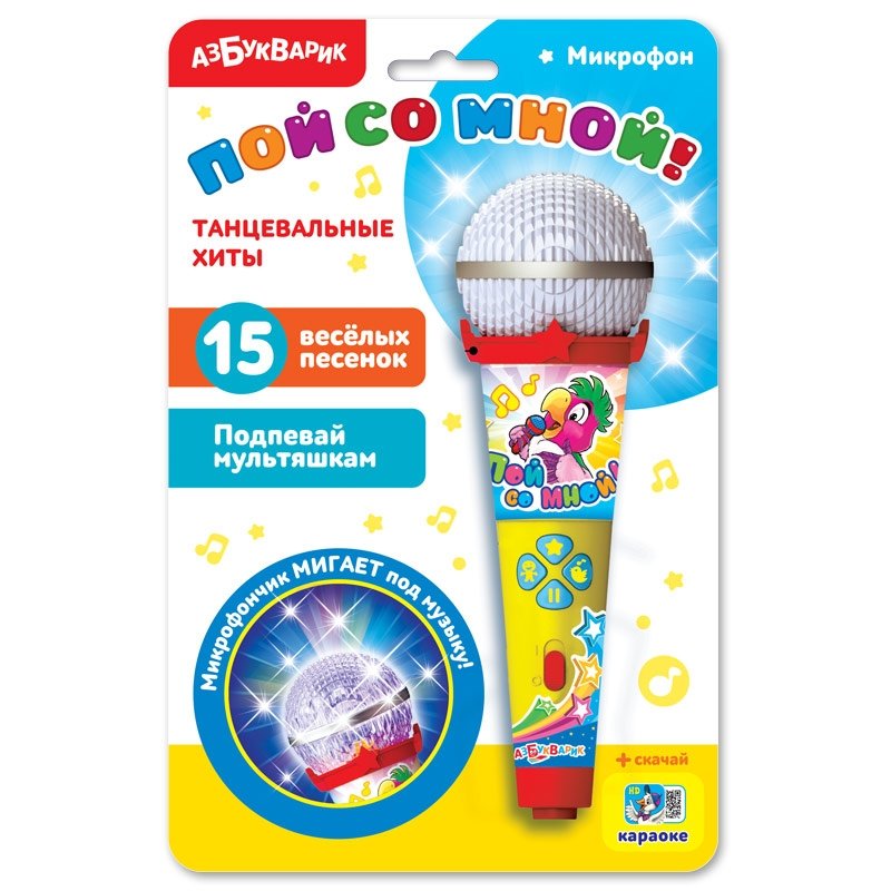 Этот микрофончик светится под музыку, а на каждой его кнопочке записано 5 танцевальных хитов, включая «Если нравится тебе, то делай так», «Полька», «Чунга-чанга», «Арам зам зам», «Танец утят», «Антошка», «Тридцать три коровы» и другие! + Бонус: возможность скачать музыкальную книгу «Караоке» для мобильного или планшета по QR-коду на упаковке.