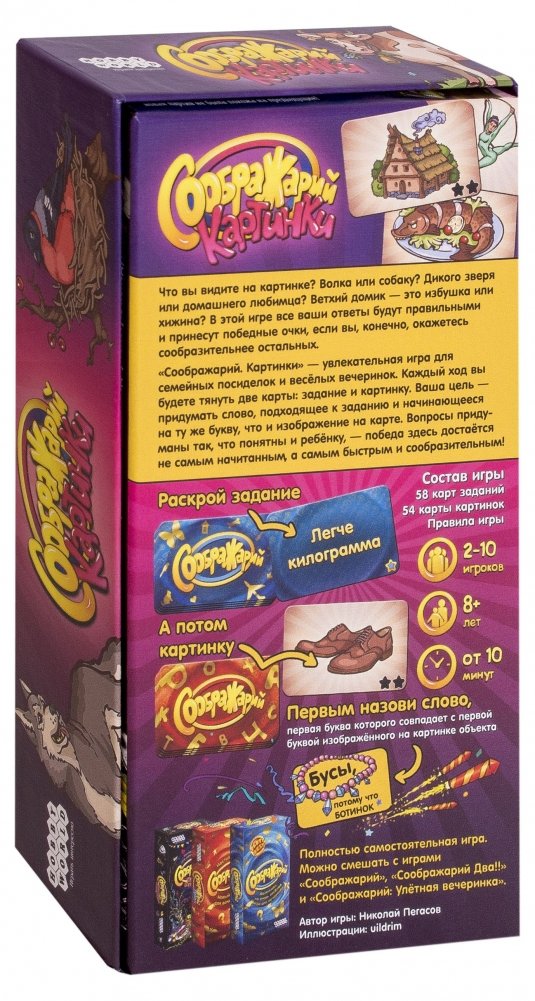 "Соображарий. Картинки!" – это продолжение серии увлекательных развивающих игр для всей семьи и для любого возраста. Сама по себе очень проста в освоении, динамична, подходит одновременно для детей и взрослых, отлично развивает логику, словарный запас, аналитическое мышление, реакцию и т.д. В неё можно играть практически везде, взять её с собой также не составит никакого труда.