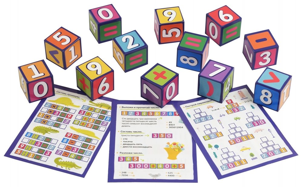 Это одна из лучших игр для развития вашего ребёнка. Углы кубиков во время игры активизируют речевые рецепторы на ладошках. На кубиках есть цифры и математические знаки.