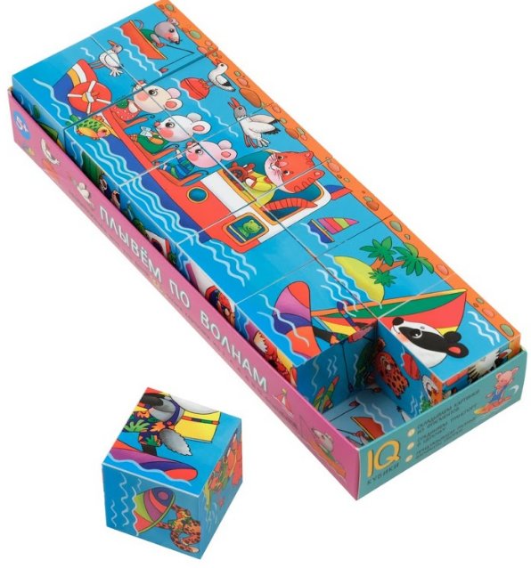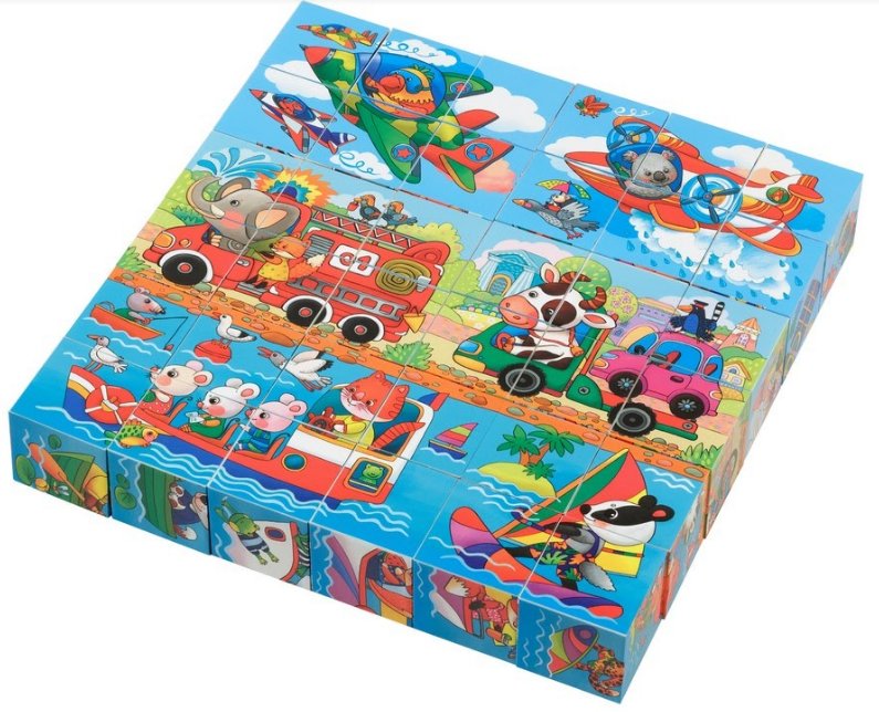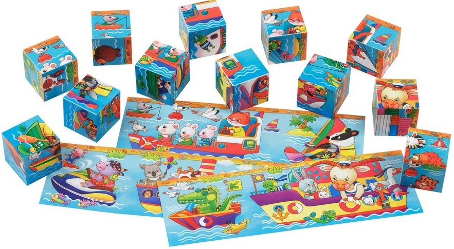 Набор состоит из 12 кубиков размером 4х4 см. Ребёнку нужно сложить картинки из 2, 4 и 6 фрагментов. В этом ему помогут листовки-подсказки с изображением водного транспорта. Далее транспорт можно соединить в любой последовательности, картинки взаимозаменяемы. Во время игры происходит знакомство с понятиями "часть и целое", развивается умение работать по образцу. Наклейки на кубики сделаны из качественной гладкой бумаги, которая не портится от игры.