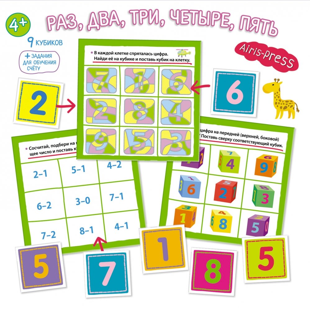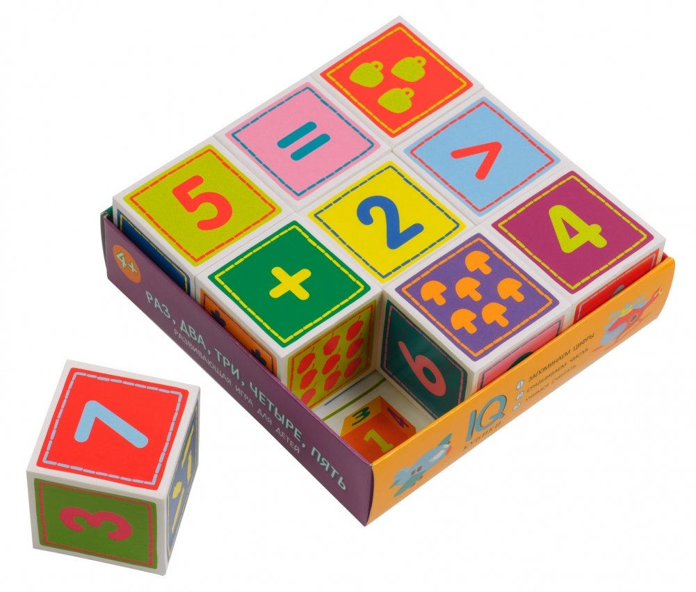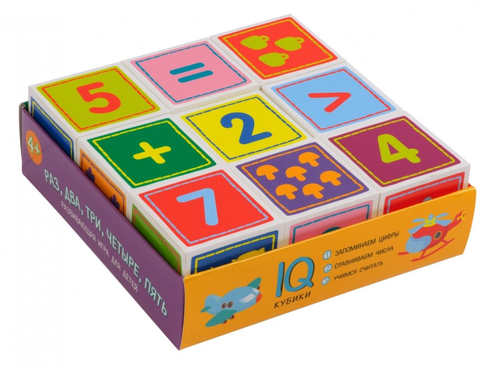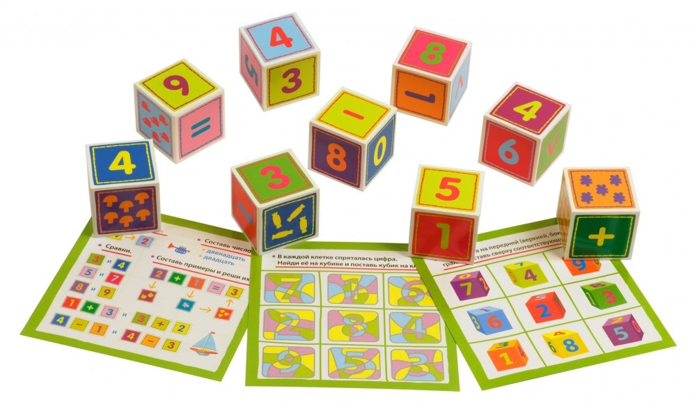 Комплект из 9 кубиков разработан специально для обучению счёту детей от 4 лет. Ребёнок познакомится с цифрами и математическими знаками. Во время игры происходит развитие навыка счёта, тренировка мелкой моторики. Кроме того, на кубиках изображено разное количество предметов.