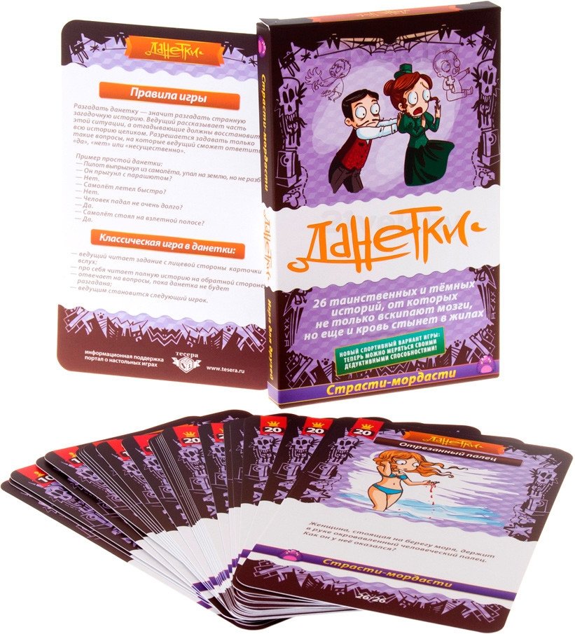 Верно, это третье издание Данеток. И вот чем оно отличается от предыдущих: Внутри - 26 непростых историй. Мы отобрали самые сбалансированные и интересные данетки из серии. Спортивные правила - теперь вы отгадываете данетку на время. Количество вопросов ограничено, а значит, придётся подумать как следует. В новых правилах также изменилась система подсчёта очков. Это чтобы было интереснее играть и выигрывать. Как играть по новым правилам? Цель та же - задавать ведущему вопросы, на которые можно ответить «да», «нет» или «неважно». И разгадать данетку. Но теперь у каждого из вас только четыре вопроса. После каждого круга вопросов - то есть, когда каждый игрок задаст свой - ведущий зачитывает одну подсказку. Подсказка отнимает одно победное очко. То есть, чем быстрее вы разгадаете данетку, тем больше очков получите. Такие правила хорошо подходят для конкурсов на вечеринках и корпоративах.