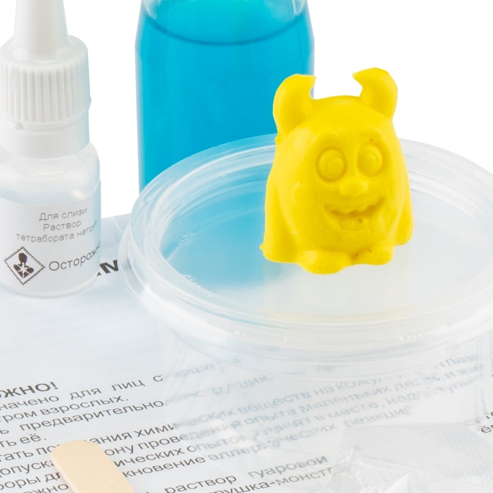 В комплекте: раствор гуаровой камеди с красителем, раствор тетробората натрия, пластиковая емкость, игрушка-монстрик, палочка для размешивания, перчатки, инструкция.