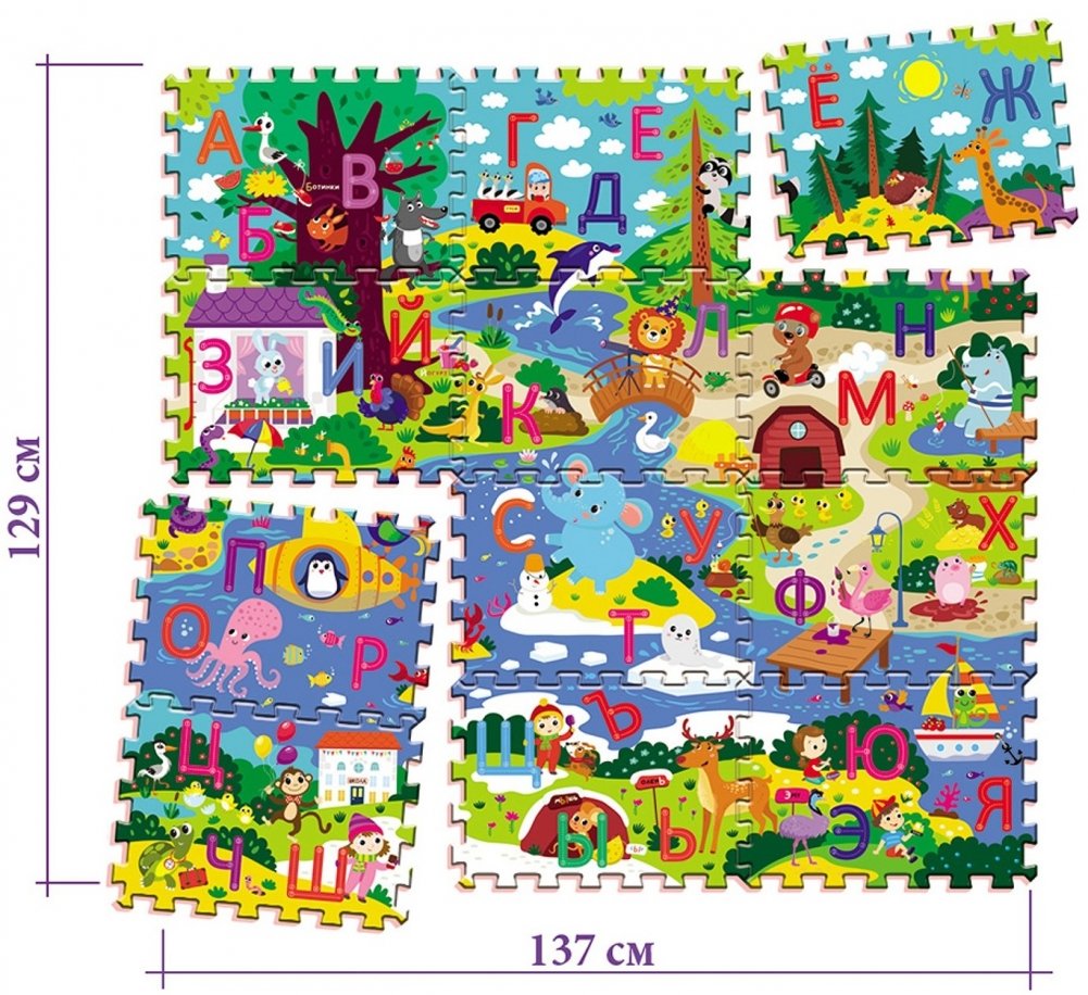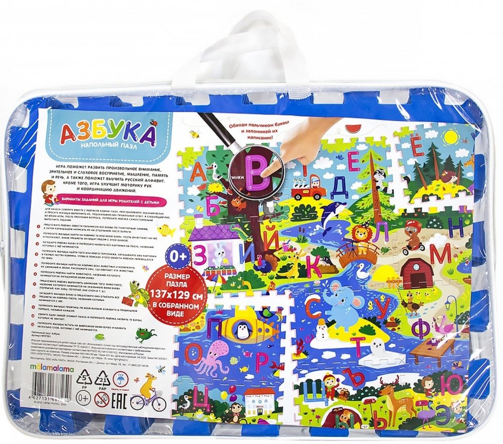 Напольный пазл -это большой яркий пазл из 12 деталей, который не оставит равнодушным ни малыша, ни родителей! Пазл поможет развить произвольное внимание, зрительное и слуховое восприятие, мышление, память и речь, а также поможет выучить русский алфавит. Кроме того, игра улучшит моторику рук и координацию движений.