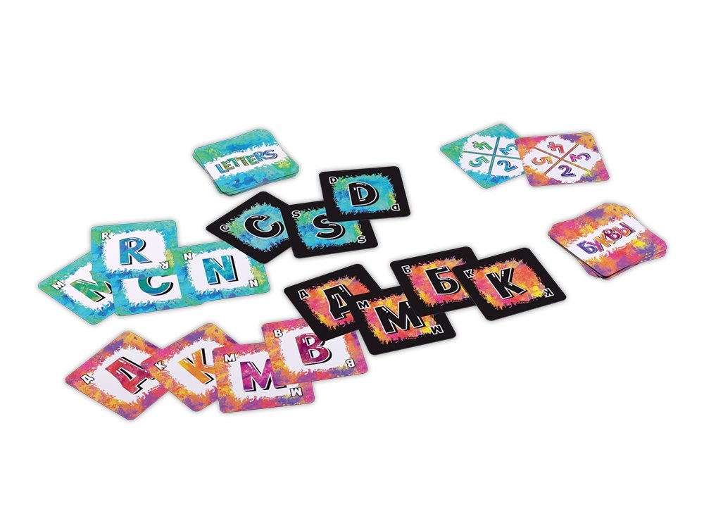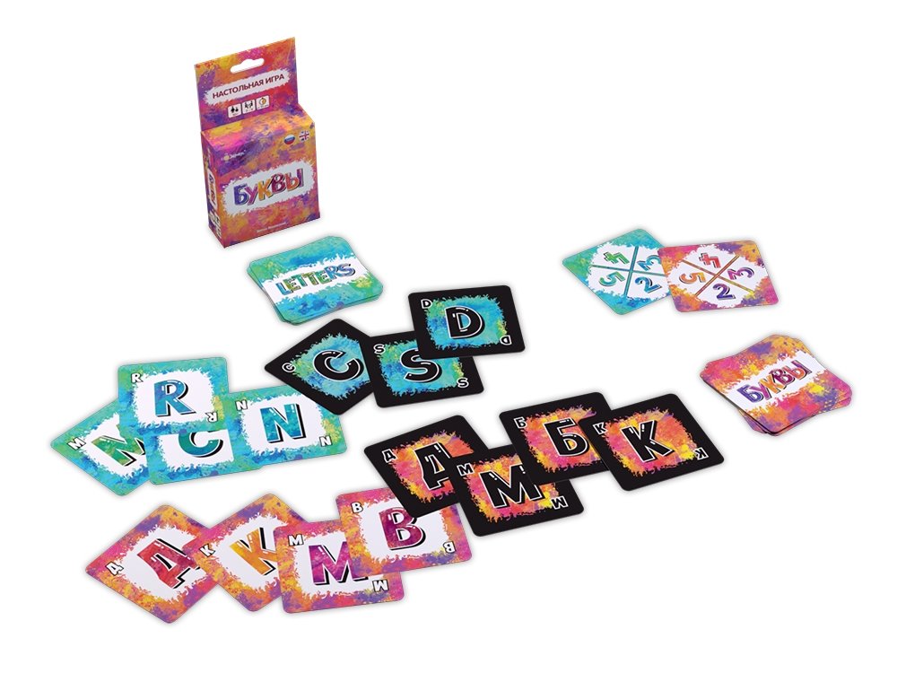 Важно: в игре есть два набора карточек с буквами - русскими (буквы "Б", "В", "Д", "К", "М", "Н", "П", "Р", "С", "Т") и английскими (буквы "C", "D", "F", "H", "L", "M", "N", "R", "S", "T"). Благодаря этому вы можете играть в "Буквы" на разных языках!
