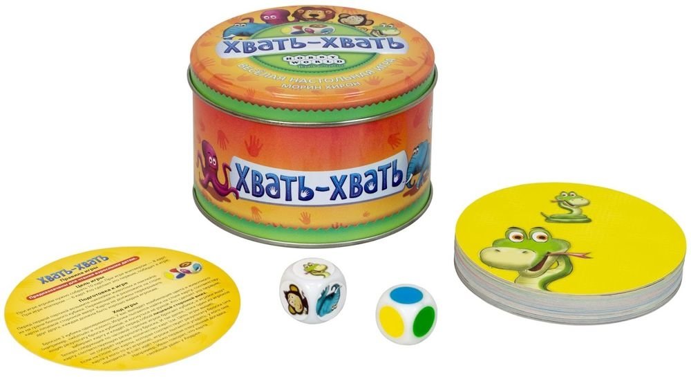 «Хвать-хвать» — быстрая игра на развитие реакции и наблюдательности. Бросьте кубики и быстрее всех найдите карту, которая совпадает с результатом. А если такой уже нет, попробуйте вспомнить, кто её забрал. Докажите, что у вас самые зоркие глаза, самые быстрые руки и самая лучшая память!