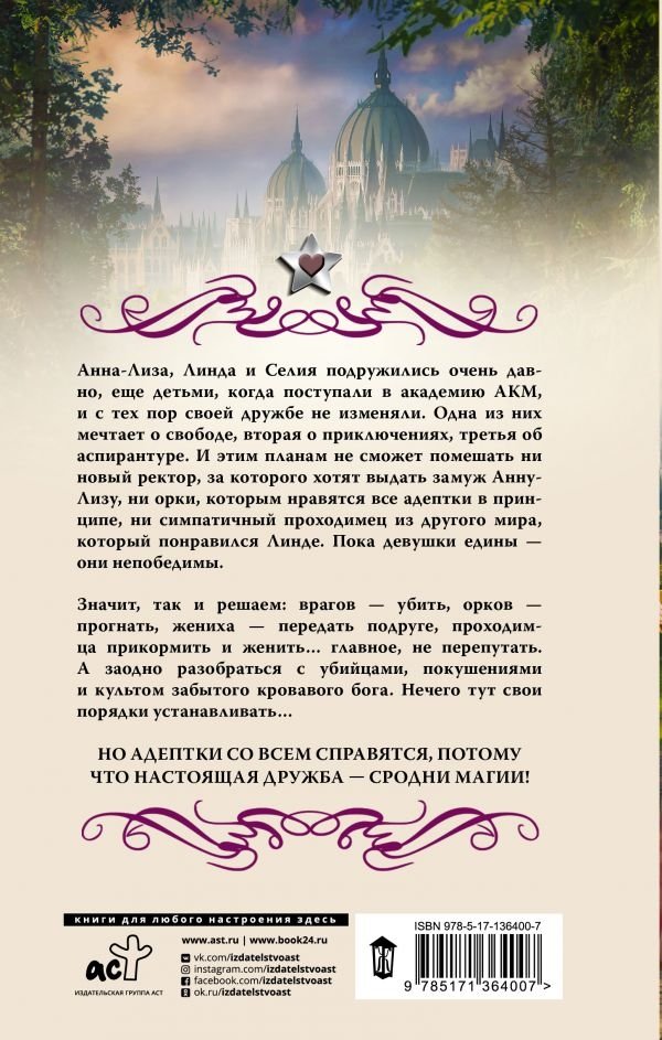 Анна-Лиза, Линда и Селия подружились очень давно, еще детьми, когда поступали в академию АКМ, и с тех пор своей дружбе не изменяли. Одна из них мечтает о свободе, вторая о приключениях, третья об аспирантуре. И этим планам не сможет помешать ни новый ректор, за которого хотят выдать замуж Анну-Лизу, ни орки, которым нравятся все адептки в принципе, ни симпатичный проходимец из другого мира, который понравился Линде. Пока девушки едины — они непобедимы. Значит, так и решаем: врагов — убить, орков — прогнать, жениха — передать подруге, проходимца прикормить и женить… главное не перепутать. А заодно разобраться с убийцами, покушениями и культом забытого кровавого бога. Нечего тут свои порядки устанавливать…