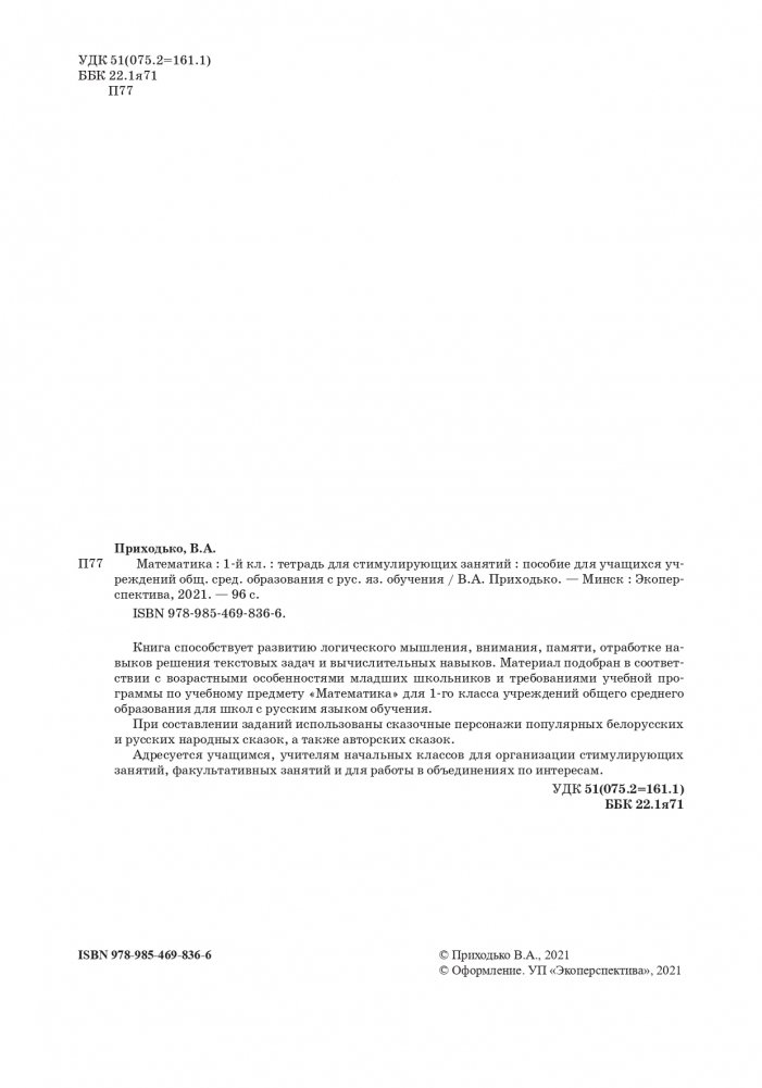 Книга способствует развитию логического мышления, внимания, памяти, отработке навыков решения текстовых задач и вычислительных навыков. Материал подобран в соответствии с возрастными особенностями младших школьников и требованиями учебной программы по учебному предмету "Математика" для 1-го класса учреждений общего среднего образования для школ с русским языком обучения.