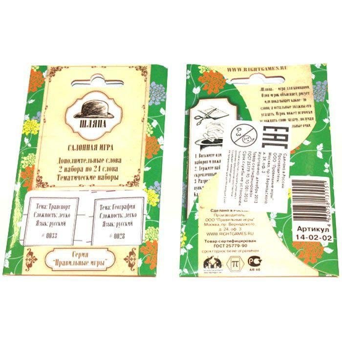 Дополнительные наборы слов для игры "Шляпа" содержат слова разной сложности и различной тематики (история, фэнтези, биология, кухня, эзотерика, знаменитости, литература и т.д.), а также слова на иностранных языках. Каждый такой набор имеет порядковый номер, на нем указана тема, сложность слов и язык. Таким образом, вы всегда сможете использовать в игре совершенно новые слова. Но Вы можете и сами придумать слова и словосочетания для игры - достаточно будет написать их на листах бумаги и положить в Шляпу. Набор пустых карточек для Ваших слов входит в набор игры.