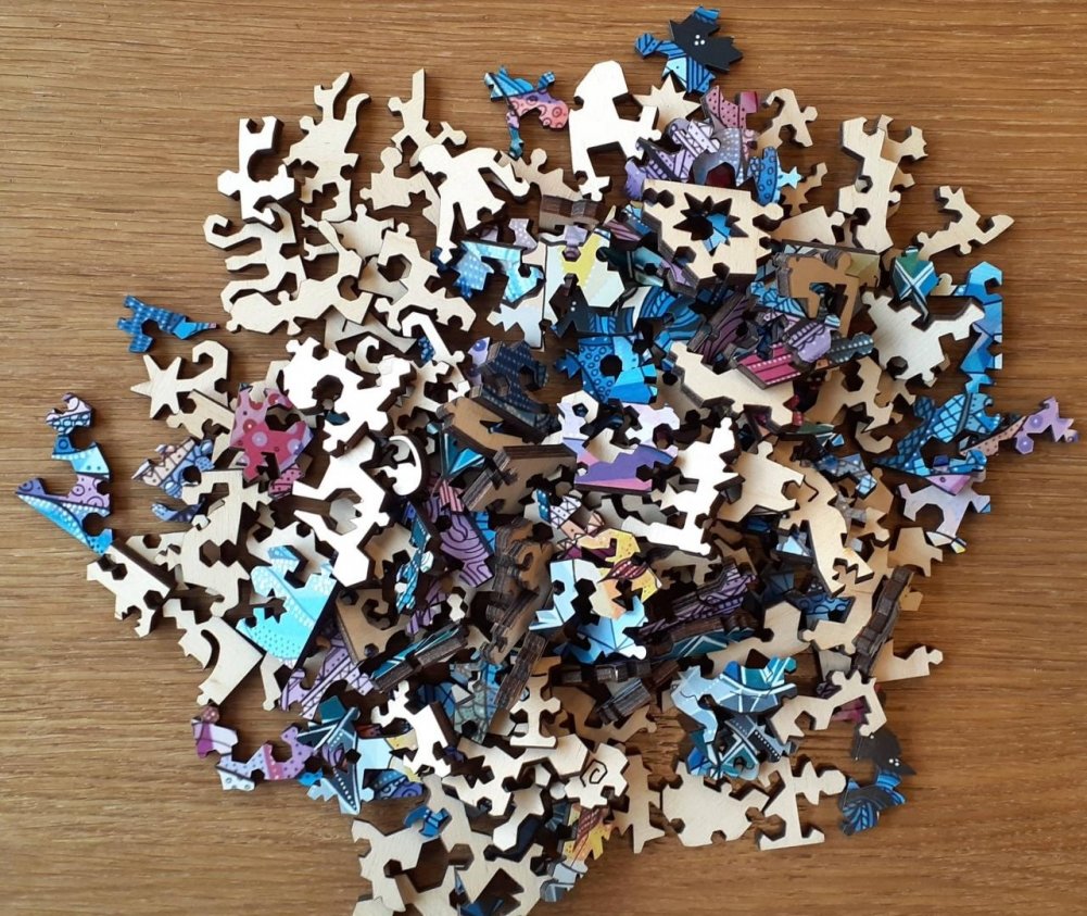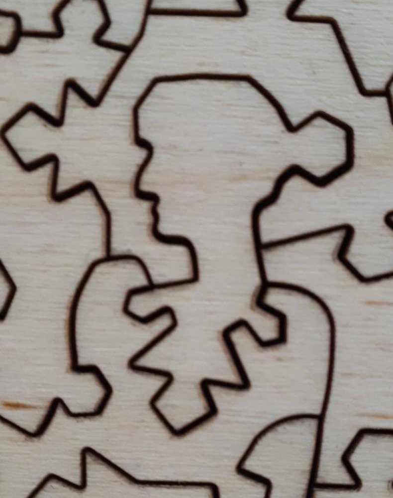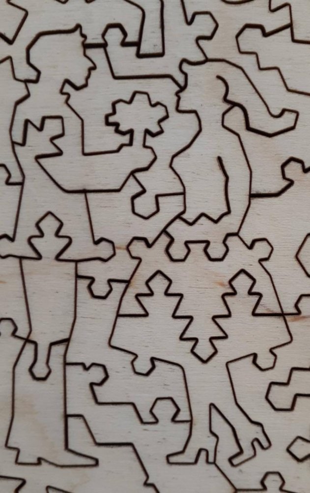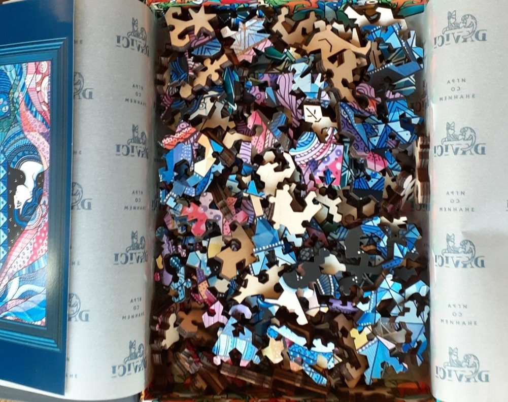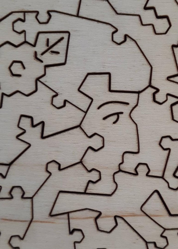 Геометрия деталей пазла повторяет ясность, простоту и остроту суждений Ахматовой. Углы, ромбы и шестиугольники - как чёткие кристаллы слов. Книга стихов и перо, канделябр, цветы и голубка - как близкие образы, из которых соткана ахматовская поэзия. Совершенно новое исполнение деталей.