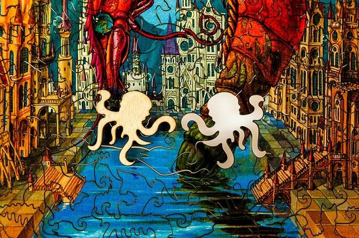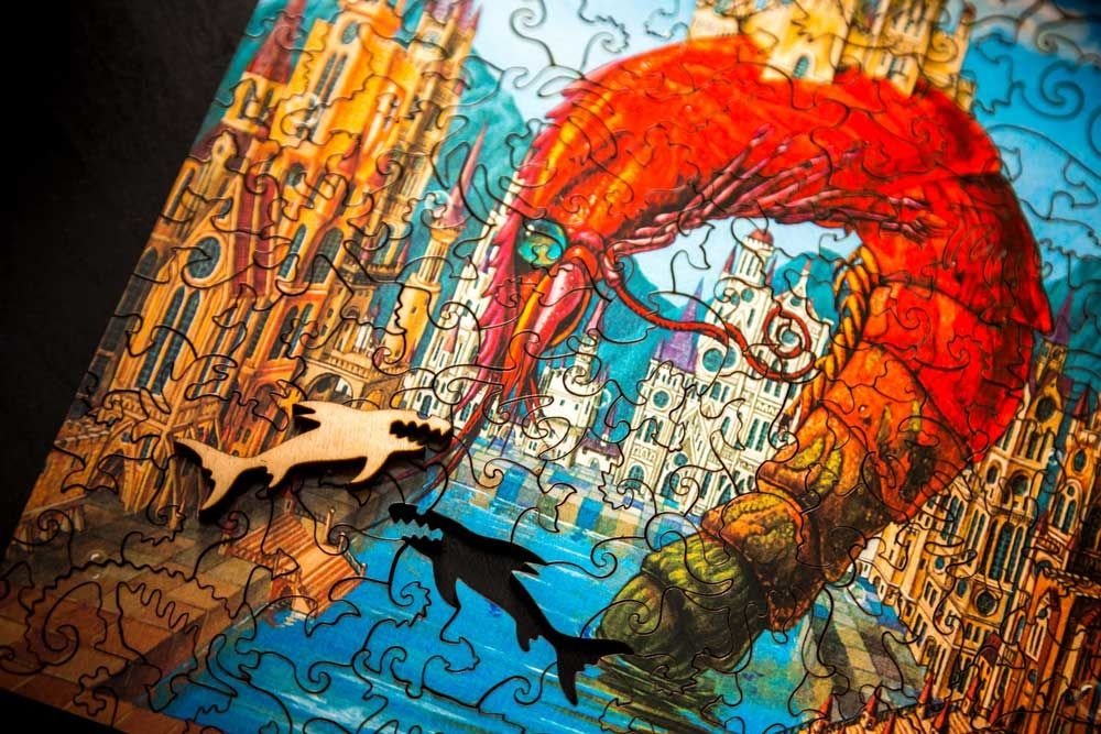 Гармоничная часть города или инородный объект? Креветка воплощает суть природы, а городские строения и мощеные мостовые только подчеркивают вечную диалектику природы и человека. В поддержку красной креветке - детали пазла: населяющие водную заводь представители мирового океана. Пазл очень приятен в сборке из-за художественности зацепов.
