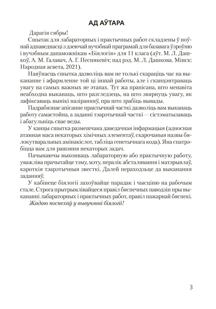 Сшытак падрыхтаваны ў адпаведнасці з вучэбнай праграмай (базавы ўзровень) і вучэбным дапаможнікам па біялогіі для 11 класа ўстаноў агульнай сярэдняй адукацыі. Выданне прызначана для больш эфектыўнага выканання вучнямі лабараторных і практычных работ на ўроках. Выкарыстанне сшытка дазволіць не толькі сэканоміць час пры выкананні і афармленні той ці іншай работы, але і сканцэнтраваць увагу на самых важных яе этапах. Прыведзеныя заданні рознага ўзроўню складанасці дапамогуць вучням лепш зразумець і замацаваць матэрыял, а настаўніку — арганізаваць дыферэнцыраваны падыход да навучання біялогіі.