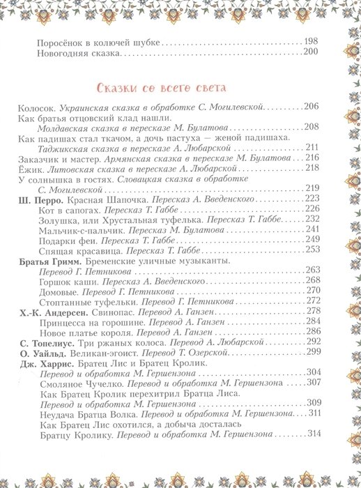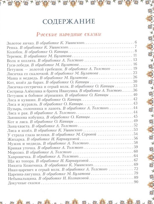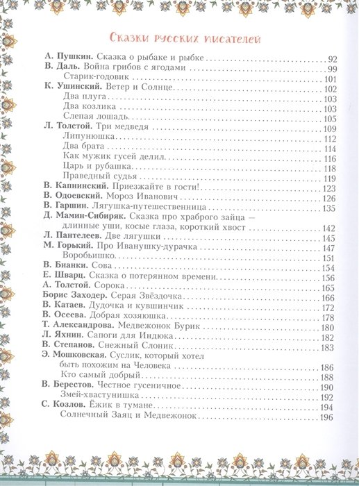 В сборник вошли русские народные, украинские, армянские, словацкие, таджикские сказки, а также сказки русских и зарубежных писателей: А.С. Пушкина, Л.Н. Толстого, В.М. Гаршина, Бориса Заходера, В.П. Катаева, С.Г. Козлова, Х.К. Андерсена, О. Уайльда и многих-многих других.