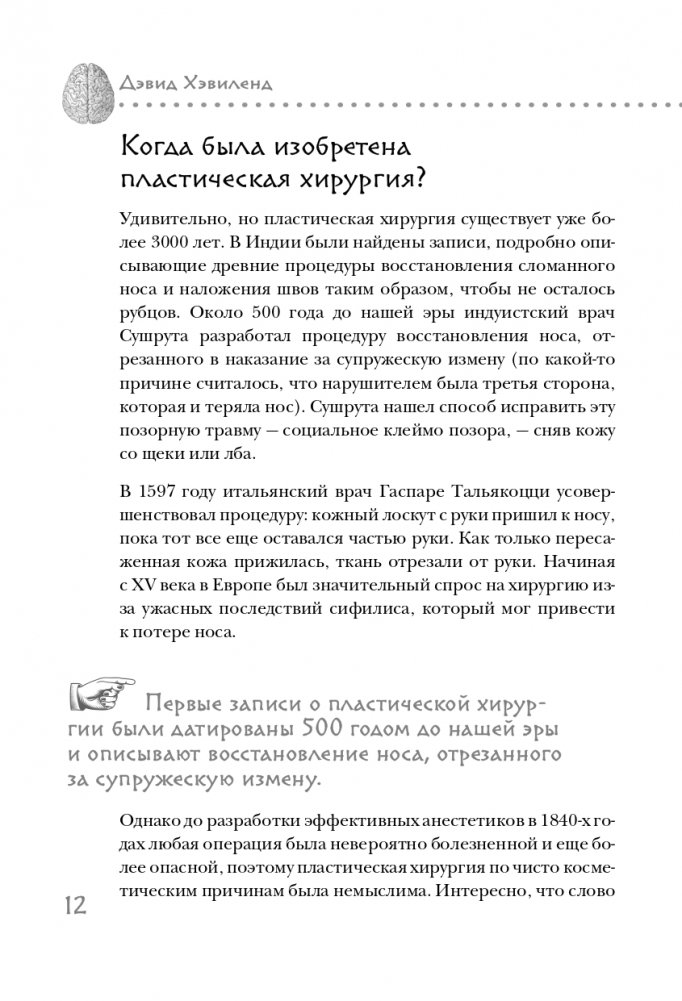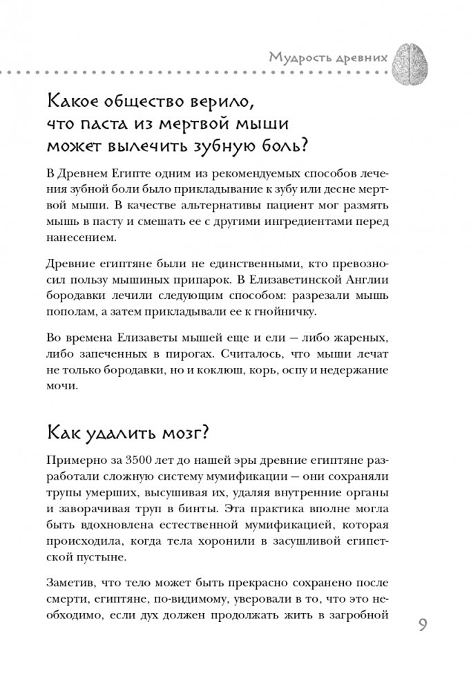 Медицина не всегда была такой, какой мы ее знаем сейчас. Когда-то она пользовалась странными, не всегда эффективными и просто страшными методами, а у врачей были весьма специфические представления о работе тела. Много экспериментов было произведено, прежде чем медицина обрела свой современный облик, и эта книга расскажет вам о самых причудливых медицинских практиках и процедурах. Какое необычное применение находили древние египтяне экскрементам крокодила? Когда была изобретена пластическая хирургия? Правда ли, что впервые переливание крови сделали древние инки? Вы узнаете, чего так боялась общественность после открытия рентгеновских лучей, кто такой нулевой пациент и почему врачи на старых фотографиях часто держат в руках колбу. Но не только истории из прошлого ждут вас в этой книге, есть в ней и те вопросы, над которыми вы сами наверняка хоть раз задумывались: например, сколько времени нужно, чтобы переварить жевательную резинку, какой процент мозга мы используем, и влияет ли полнолуние на настроение людей.