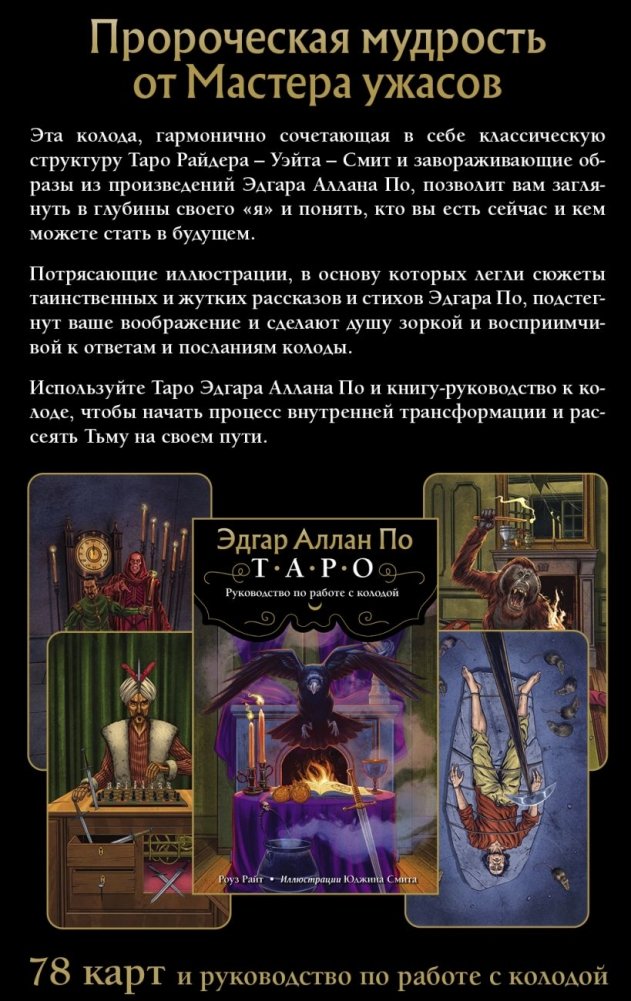 Загляните в глубины своего "я" и поймите – кто вы есть сейчас и кем можете стать в будущем вместе с Таро Эдгара Аллана По! Эта колода гармонично сочетает в себе завораживающие образы из произведений Эдгара Аллана По и классическую структуру Таро Артура Уэйта, поэтому подойдет даже начинающим тарологам. Подробное руководство к колоде, созданное тарологом Роуз Райт, содержит описания всех карт колоды, авторские расклады, рекомендации по работе с перевернутыми картами, нумерологическими значениями арканов и общие рекомендации по работе с Таро. Потрясающие иллюстрации художника Юджина Смита, в основу которых легли сюжеты таинственных и жутких рассказов и стихов Эдгара По, подстегнут ваше воображение и сделают душу зоркой и восприимчивой к ответам и посланиям колоды.