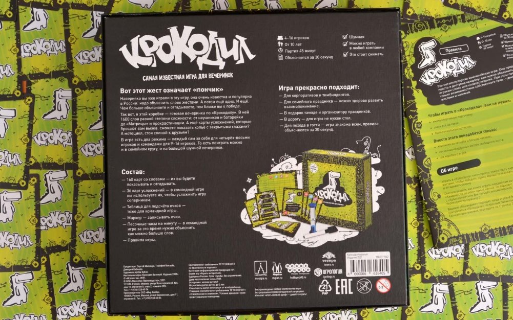 «Крокодил» впервые издан в виде коробки. В отличие от простого словесного «Крокодила», здесь есть много-много интересных правил и заданий, которые помогут вам замечательно развлечься на вечеринке, празднике или в дороге.